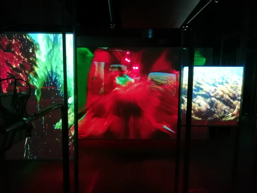 După mai mult de două ore de stat la rând, pare aproape imposibil ca tensiunea creată să nu se soldeze cu o mare dezamăgire (dacă veţi vizita Bienala în următoarele luni – e deschisă până pe 24 noiembrie – nu vă temeţi, cozile uriaşe sunt doar în preview). Dar iată că pariul a fost până la urmă câştigător. Uşile centrale din pavilion sunt rezervate doar pentru ieşire, ultima parte a cozii conducându-ne prin grădina luxuriantă din jurul clădirii, spre o uşă de serviciu şi introducându-ne, astfel, gradual în atmosfera germinativă a acestui show cu totul aparte. Pe dosul măştii de hârtie care se oferă fiecărui vizitator la intrare citim că Laure Prouvost a imaginat, pentru acest proiect, „un univers lichid şi tentacular, articulându-se în jurul unei reflecţii despre noţiunile de generaţii şi identităţi”. Reflecţie intergeneraţională şi postumanistă, punct de ruptură, de deconectare şi neînţelegere discursivă, culminând, însă, eliberator, într-un voiaj escapist, utopic-suprarealist: acestea ar fi, cumva, cele trei momente ale operei totale, complet imersive şi sinestezice, concepute de talentata artistă franceză, operă la care participi deplasându-te dintr-o cameră în alta a spaţiului expoziţional. Toate simţurile sunt activate: în afară de vizual, simţul olfactiv (miros învăluitor de alge marine, pe care ajungi să îl simţi pe limbă), tactilul (podeaua e recreată în camera centrală, în care se proiectează filmul ce stă în miezul expoziţiei, precum un nisip moale şi denivelat), auditivul (şoapte ASMR). Într-un fel, prin tematică şi realizare, pavilionul francez e chintesenţa acestei Bienale, într-o ecuaţie simplă: era comunicării + era încălzirii globale = sfârşitul Antropocenului. Video-ul este şi el realizat impecabil (câteva dume şi platitudini de la final puteau, totuşi, lipsi), cu cadre derulate accelerat (ochi – apă – moluşte) şi o reţetă clară de priming (amorsare): sea (mare) – see (a vedea). Una peste alta, dacă nu treci în fugă prin pavilion, sigur ieşi un pic high.