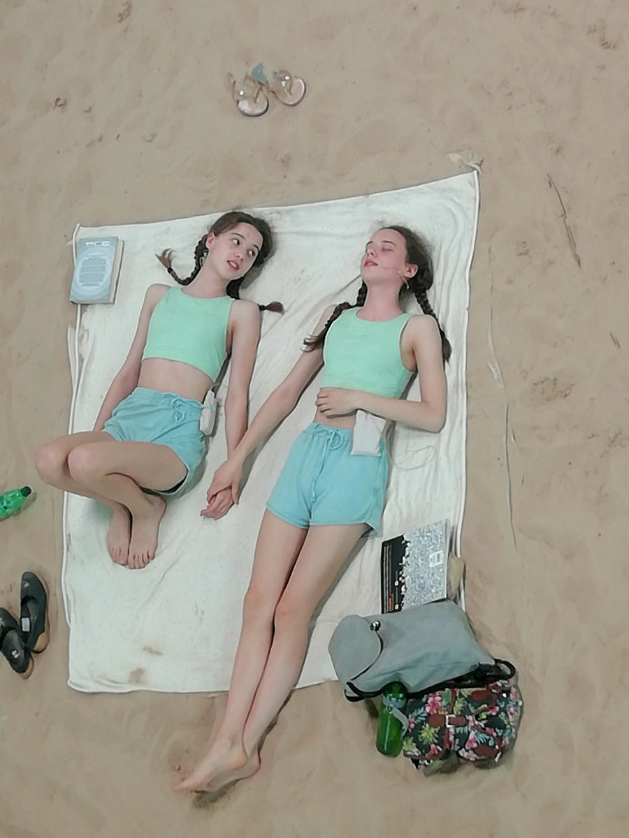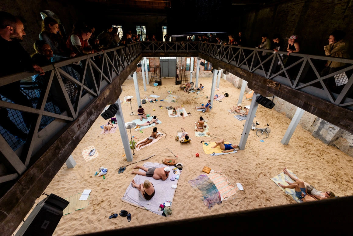Pe acest fundal este performată în buclă o operă contemporană, cu un libret tulburător: cele mai stupide jene şi obsesii ale omului contemporan (desigur, bronzul şi cremele de protecţie solară sunt la mare cinste) sunt invocate pentru a adresa, cu subtilitate, aceeaşi mare problemă a Bienalei: încălzirea globală. Performerii cântă incredibil de bine, în timp ce stau tolăniţi pe nisip. Efectul produs în publicul spectator e ambivalent: pe de-o parte, suntem vrăjiţi, hipnotizaţi de acest performance în care nu se întâmplă, de fapt, nimic, iar pe de alta, contrar atmosferei imersive de relaxare, devenim neliniştiţi pătrunzând semnificaţia reală a versurilor. Pe mine, opera m-a făcut să mă gândesc la excepţionalul eseu din 1989 al lui Félix Guattari Cele trei ecologii: foarte simplu spus, preocuparea pentru prezervarea mediului înconjurător nu e suficientă şi nu e eficace fără dublarea ei de o ecologie a relaţiilor sociale şi de o ecologie a minţii şi sinelui. Oftatul unui Pământ epuizat: