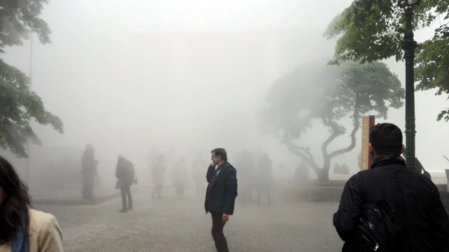 Deşi dimineaţa e însorită, clădirea Pavilionului Central şi împrejurimile sunt parţial camuflate de ceaţă. E vorba, desigur, tot de o operă de artă: Lara Favaretto a propus conceptul Thinking Head (2017-2019), a cărui concretizare vizibilă e aburul care iese din acoperişul clădirii şi ne învăluie.