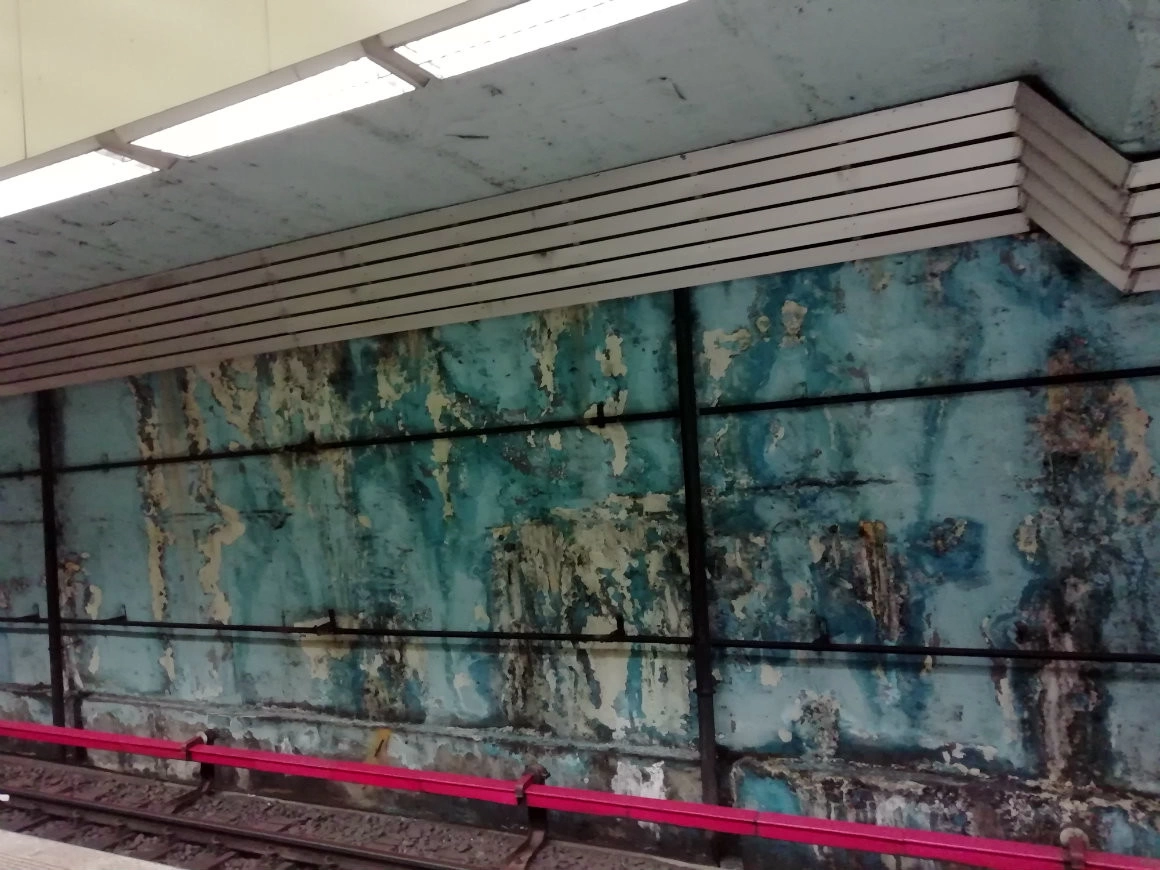 Reveniţi în Bucureşti cu privirea inundată de mare şi de iminenţa potopului, dăm peste acest perete de la staţia de metrou Griviţa, distrus artistic de umezeală, despre care Daria şi cu mine cădem imediat de acord că şi-ar fi găsit perfect locul în Bienala 2019. Cronometrul încălzirii globale sună altfel în oraşul plutitor, unul dintre primele ameninţate cu dispariţia definitivă sub ape. Dar până atunci, toată lumea se bronzează satisfăcută la cozi sau pe plaje artificiale şi e vreme de încă vreo câteva bienale.