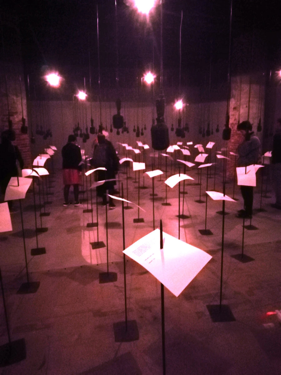 E vorba despre o excepţională instalaţie audio construită într-o cameră slab luminată, în care intri şi te plimbi, strecurându-te printre o sută de suliţe în care se găsesc înfipte, ca pe portative, o sută de poeme scrise de o sută de poeţi din toate colţurile lumii care au fost închişi pentru opera şi poziţiile lor politice de-a lungul timpului, mai precis din secolul al VII-lea şi până în zilele noastre (chiar titlul lucrării – „Pentru că, pe limba ta, eu nu încap” – e inspirat de poetul şi filosoful azer din secolul al XIV-lea Imadaddin Nasimi). Din tavan coboară o sută de microfoane, câte unul în dreptul fiecărui poem tras în ţeapă. Te strecori şi încerci să citeşti câte un poem, în dreptul unui microfon, doar că funcţia microfoanelor este inversată: sunt o sută de difuzoare din care se aud voci anonime recitând, pe rând, cele o sută de poeme, în limbile în care au fost ele create. Vocile, şoaptele te împresoară şi te vrăjesc, te fac să pluteşti pe fluviul istoriei colective, uneori înţelegând ce se spune, de cele mai multe ori nu. Metafora inversării raporturilor obişnuite de putere e teribil de vie: restituirea vocii celui redus la tăcere, vocea exilatului, a poemului ars, cenzurat. Mesajul e însă ambivalent, pentru că rămânem într-un spaţiu carceral, în care suliţele şi microfoanele proiectează în lumina slabă umbrele unor gratii de închisoare.