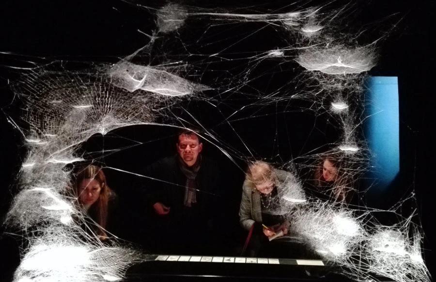 Câteva vorbe se cuvin spuse şi despre o lucrare de artă procesuală care mi-a mers la inimă, găzduită într-o „cutie neagră” creată în faţa pavilionului central: artistul argentinian Tomás Saraceno a avut ideea să delege munca acestei opere (outsourcing-ul e atât de la modă în arta contemporană) unor păianjeni de trei feluri diferite, care au ţesut, vreme de trei luni, o minunăţie de pânză ce arată ca o galaxie în miniatură, invitând vizitatorii să-şi ghicească viitorul prin descifrarea acestei ţesături de complexitatea unui limbaj simbolic (Spider/Web Pavillion 7).