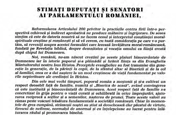 „Reformularea Articolului 200 privitor la practicile contra firii într-o perspectivă echivocă și indirect aprobativă ne produce mâhnire și îngrijorare. De aceea simțim că este de datoria noastră să ne facem ecoul și interpretul conștiinței moral spirituale creștine și românești și să vă cerem, cu toată considerația pe care v-o purtăm, să reveniți asupra acestei formulări care lezează învățătura moral-românească, fondată pe Revelația biblică, despre demnitatea și vocația omului ca ființă creată după chipul lui Dumnezeu”, a scris Teoctist în octombrie 1994.