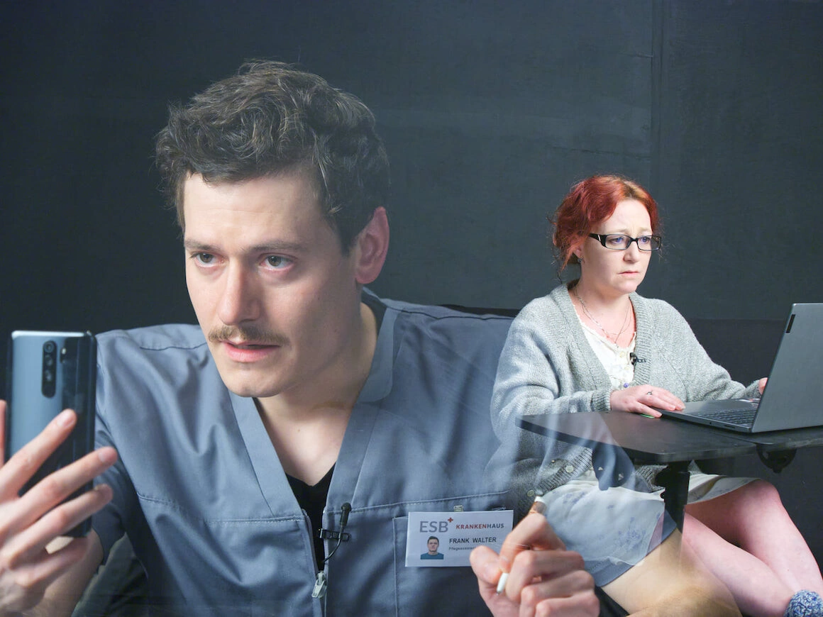 Intermediarea online susține neclaritatea și este potențial manipulatorie. Ecranul deformează realitatea, iar distanța dintre oameni nu este atenuată, dimpotrivă. Perspectiva în fiecare episod este a unui singur personaj și un rol esențial aici îl are modul în care fiecare apare în montajul video pentru spectatorul de acasă. Jurnalistul (Daniel Bucher) este live pe scenă și se raportează la imagini filmate. IT-ista (Fabiola Petri) e pe scenă, în timp ce psihologul (Daniel Plier) apare numai online. Aceeași situație și în cazul mamei (Johanna Adam), care primește un video apel de la doctorul german (Valentin Späth): ea apare și fizic, și filmată prin ecranul laptopului, el este exclusiv online. Hikikomorii (Yannick Becker și Anca Cipariu) se văd reciproc numai pe ecran, dar sunt vizibili pentru spectatori fără coconul digital în care s-au ascuns. Filmarea în timp real urmează un scenariu precis, în care viziunea fiecăruia asupra situației este negociată prin plasarea convențională a spectatorului în același spațiu fizic cu personajul sau doar ca receptor al imaginii digitale a acestuia (toți actorii sunt live în spectacol, doar decupajul video îi face să fie receptați prin intermediul ecranelor). Perspectivele unice ale personajelor asupra poveștilor sunt însă subiective și ridică întrebări privind veridicitatea lor. Nu se știe dacă povestea vloggeriței e reală, nici dacă IT-ista a fost tratată prost la interviu sau e doar percepția ei. Zbaterile sunt numai ale victimelor. Partea occidentală rămâne detașată, opacă la descifrări.