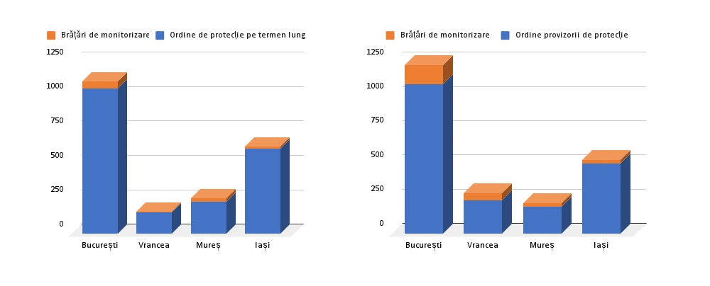 Până la finele lui septembrie, în București și județele Mureș, Iași și Vrancea, judecătorii au dat 2.057 de ordine de protecție, iar dintre acestea doar 4,4% au venit la pachet cu monitorizarea electronică. Aproximativ 12% dintre ordinele provizorii de protecție - cele date pe loc de către polițiști pe o perioadă de 5 zile - au fost însoțite de monitorizarea electronică.