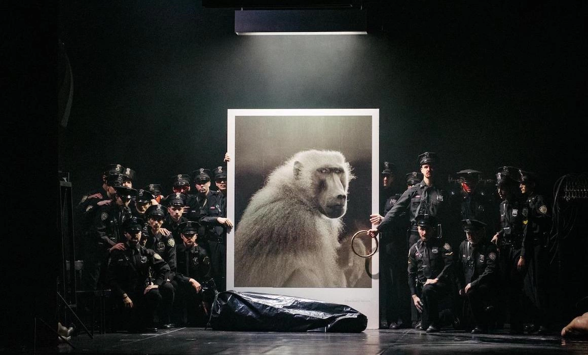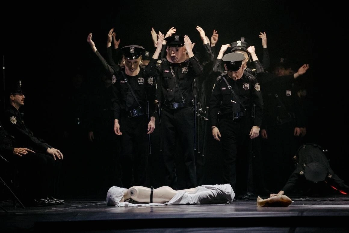 Bros este o construcție performativă pe multiple paliere. Spațiul e gol, populat uneori cu instalații metalice înfricoșătoare (un fel de sonar care seamănă cu cele puse pe tancuri și care devine aproape umanoid, ca un robot de supraveghere) sau dimpotrivă, încântătoare (un soi de orgă cu tuburi flexibile care scot apă și aburi în timp ce cântă) și cu fotografii imense, impresionante, toate portrete. Samuel Beckett, maestrul non-narativului, non-conflictului și non-personajului, al absurdului și al vieții ca o agonie inutilă; un profil de femeie tânără, un bărbat cu spatele, un gibon (cred) cu o privire scrutătoare, care pozează „artistic”. O marionetă figurativă, un copil de lemn în mărime naturală apare ca lider al polițiștilor cu care comunică prin țipete (e o caricatură de Hitler). Spațiul este întunecat, luminat doar la nivel de penumbră, uneori cu spoturi strict orientate care scrutează zona (ca reflectoarele din închisori care verifică zona de detenție), cu neoane, a căror lumină rece este intimidantă. Personajul principal este grupul de polițiști în uniforme închise la culoare, o frăție a masculinității agresive, acești Bros (de la brothers) se mișcă sincron sau formează tablouri complexe, multe violente, unele fiind replici vivante ale unor picturi celebre (Lecția de anatomie a doctorului Tulp de Rembrandt, cred că am văzut și un Rond de noapte, sunt multe picturi cu patimile lui Hristos). În contrapunct, sunt trei personaje în alb: profetul Ieremia (Valer Dellakeza), un tânăr adult, nud, victimă a poliției, care este bătut cu sălbăticie într-o scenă care amintește de patimile lui Iisus, și un copil. Vocea lui Ieremia se pierde în vâltoarea violenței, iar violența, după se poate citi în textul primit la intrare de fiecare spectator, vine de la însuși Domnul: „Ciocan ai fost pentru mine, unealtă de război; / cu tine am lovit popoarele și ți-am distrus regatele, / cu tine am lovit în cal și călăreț, cu tine am lovit calul și pe vizitiu...”. Imaginea lui Dellakeza în alb, cu barba sa impunătoare, este a unui profet rătăcit, care primește oarecum mirat ordinele unui Dumnezeu răzbunător pe slăbiciunea umană.