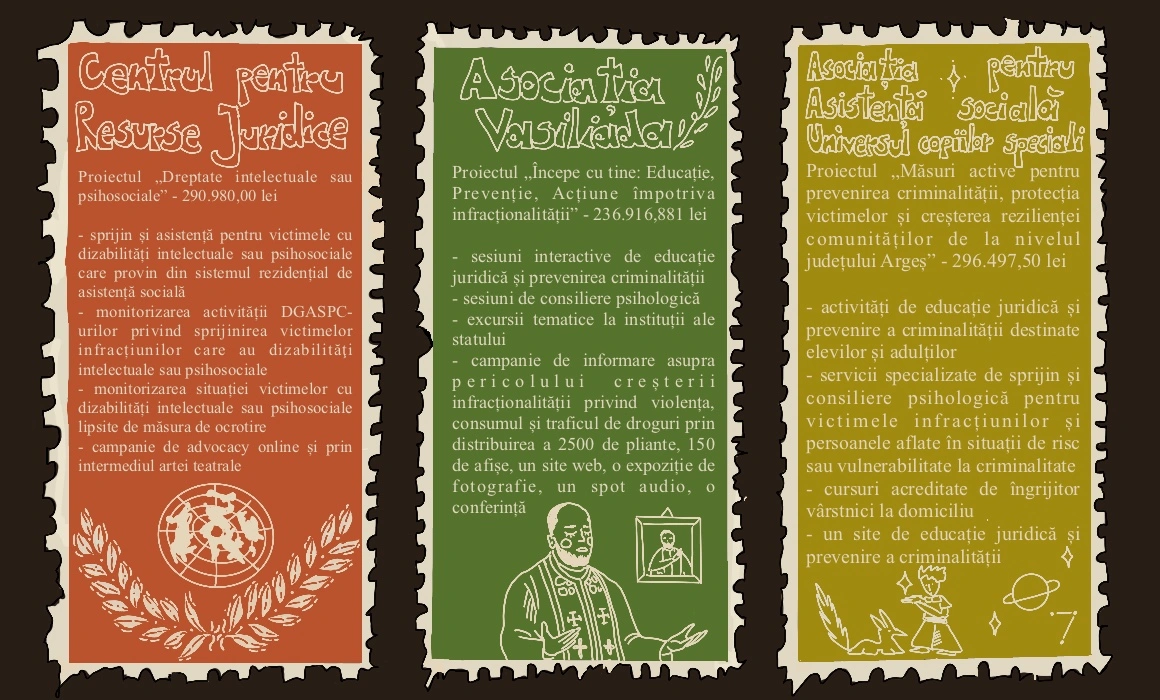 Cele trei organizații au propus proiecte pentru victimele cu dizabilități intelectuale sau psihosociale din centrele de îngrijire (CRJ), de educație juridică a copiilor din județul Craiova (Vasiliada), de prevenire a criminalității și protecția victimelor din județul Argeș (Universul copiilor speciali).