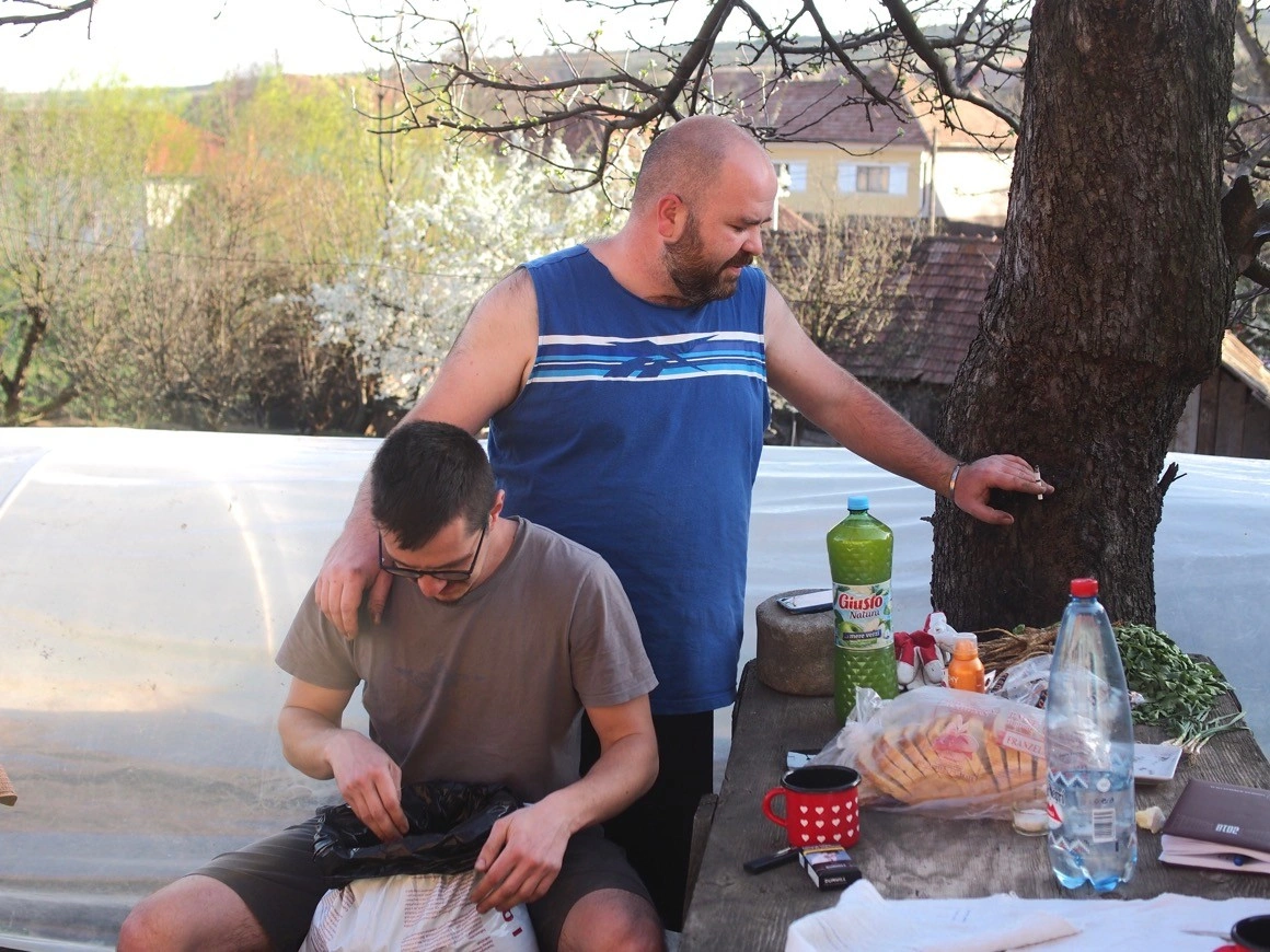 Cristi îmi face turul gospodăriei: casa, fântâna, atelierul lui de tâmplărie unde a construit recent decorul pentru piesa de teatru 3milioane, care vorbește despre strângerea de semnături pentru schimbarea definiției familiei în Constituție. Apoi ne așezăm la povești, la umbra unui copac. Pe masa de lângă noi sunt câteva legături de păstârnac, care au fost plantate anul trecut. Au rămas în pământ toată iarna, iar acum le-a scos. Unele dintre ele sunt un pic zbârcite, dar cele mai multe au rezistat impecabil în lunile friguroase. „Nu mai e acel pentru ce”, spune Cristi, privindu-l pe Paul, care muncește. „Îs așa fericit că îi place aici.”
