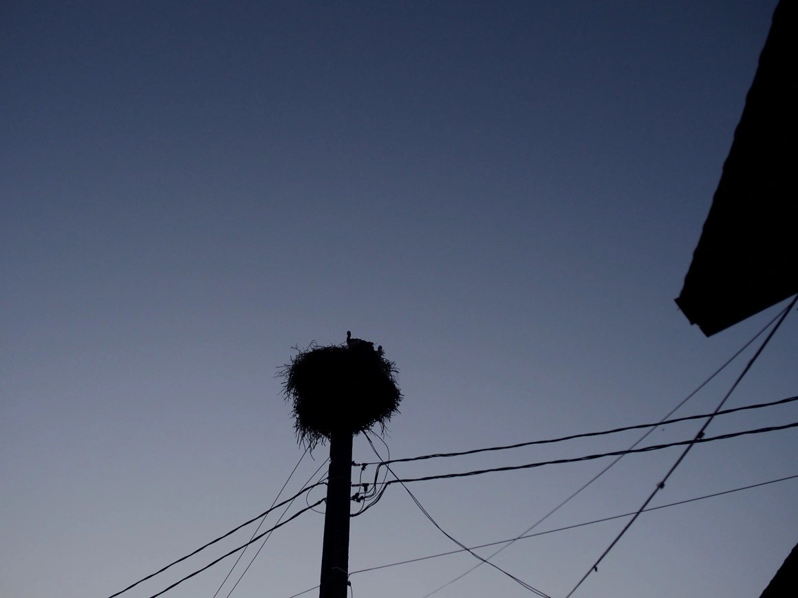Înserarea se lasă treptat peste sat. O barză se întoarce la cuib aducând niște crengi în cioc. Sunt și multe vrăbii care se agită pe lângă berze. „Unul dintre secretele pentru care cuibul rezistă în picioare e pentru că vrăbiile își fac în el cuiburi. Practic îl blindează”, explică Cristi.