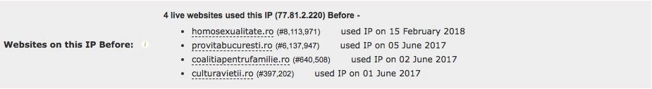 Pe prima pagină de căutare apare site-ul homosexualitate.ro, care promite „Speranță și Vindecare pentru Homosexuali”. Oferă informații despre reducerea şi eliminarea „atracţiilor homosexuale, mărturii ale unor persoane care au reuşit aceasta şi comentarii şi analize de natură socială.” Fostul IP al site-ului a mai găzduit paginile Coaliției pentru Familie, PRO VITA București și Cultura Vieții.