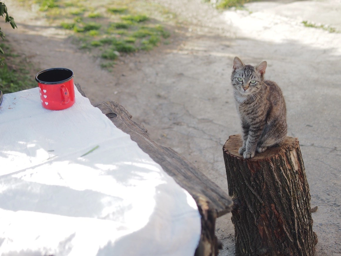 În timp ce Cristi și Paul lucrează în grădină, bunica mănâncă pe o bancă din curte salată de boeuf. Pisicile se adună la picioarele ei, iar ea le spune glumind: „V-am dat ieri să mâncați.” Mă întreabă de unde sunt, cum îi cheamă pe părinții mei, dacă am venit cu blugii ăia rupți de la București. O dor oasele, așa că nu mai poate merge la biserică. „Mi-i dor de oameni, da' oamenii s-o gătat.” Apoi îi privește pe cei doi cum sapă pământul și zice despre Cristi: „O avut dipresie. Dar îi tare fericit de când îi cu copchilu ăsta.”