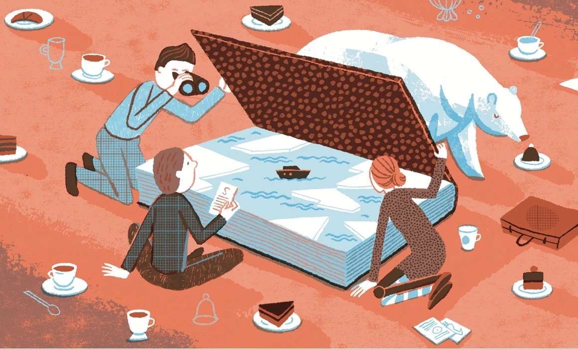 Cartea Calm Ecuatorial, scrisă și ilustrată cu multă măiestrie de Nicholas Gannon, te pune pe gânduri încă din clipa în care îi privești coperta: pe o bucată de gheață, ce plutește în mijlocul unei mări liniștite, trei copiii, înconjurați de cufere și lucruri care mai de care mai ciudate, privesc liniștiți în zare. Te poți întreba cum de sunt atât de calmi într-o situație în care oricine ar intra în panică, însă pe parcursul poveștii înțelegem că pentru Archer, Adélaïde și Oliver neobișnuitul este cât se poate de firesc.