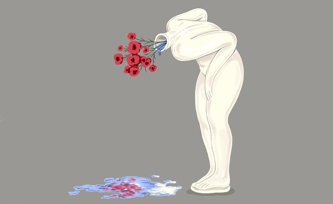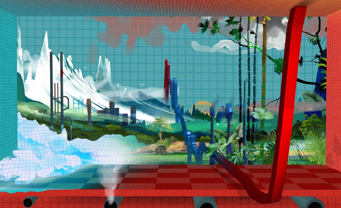 La prima vedere, totul pare sobru: mese înalte împânzesc locul și candelabre strălucitoare coboară până deasupra capetelor de adulți prinși în discuții. Dar, dacă te uiți atent, vezi oameni zâmbitori agățați de poșete-pepene și de pahare colorate, îmbrățișându-se în secvențe repetitive, ca o familie la masa de Crăciun.