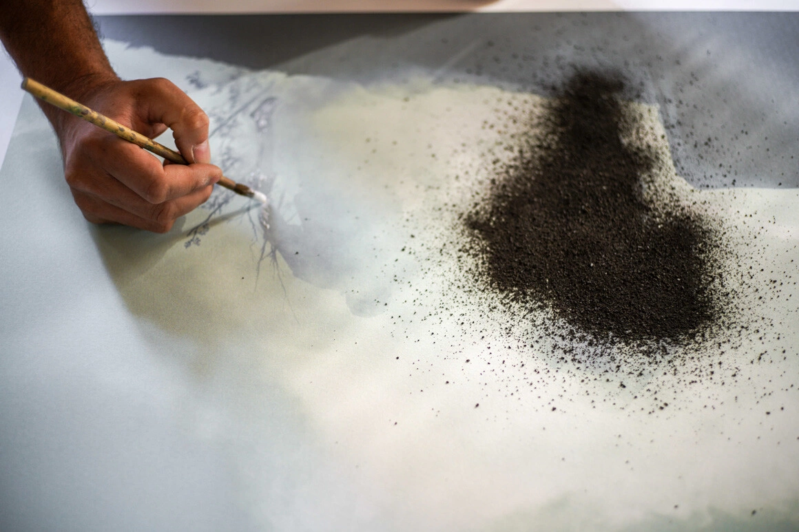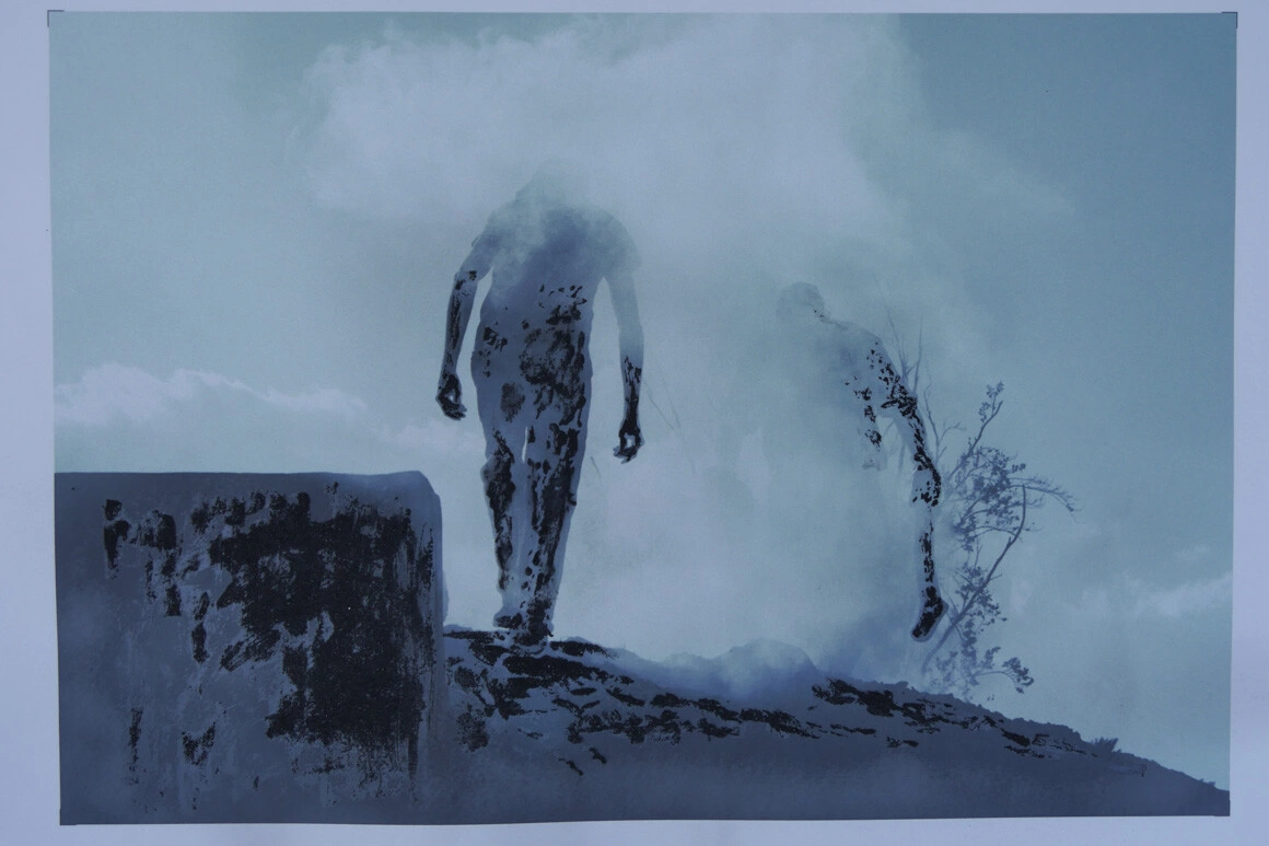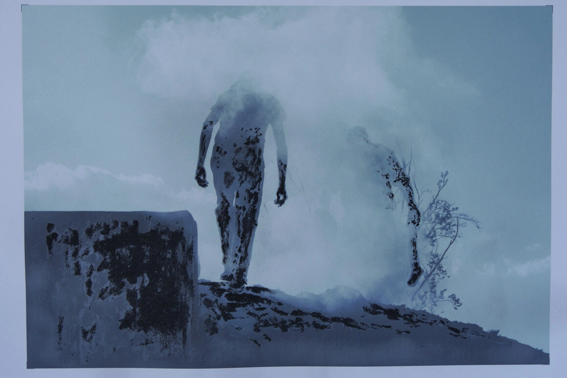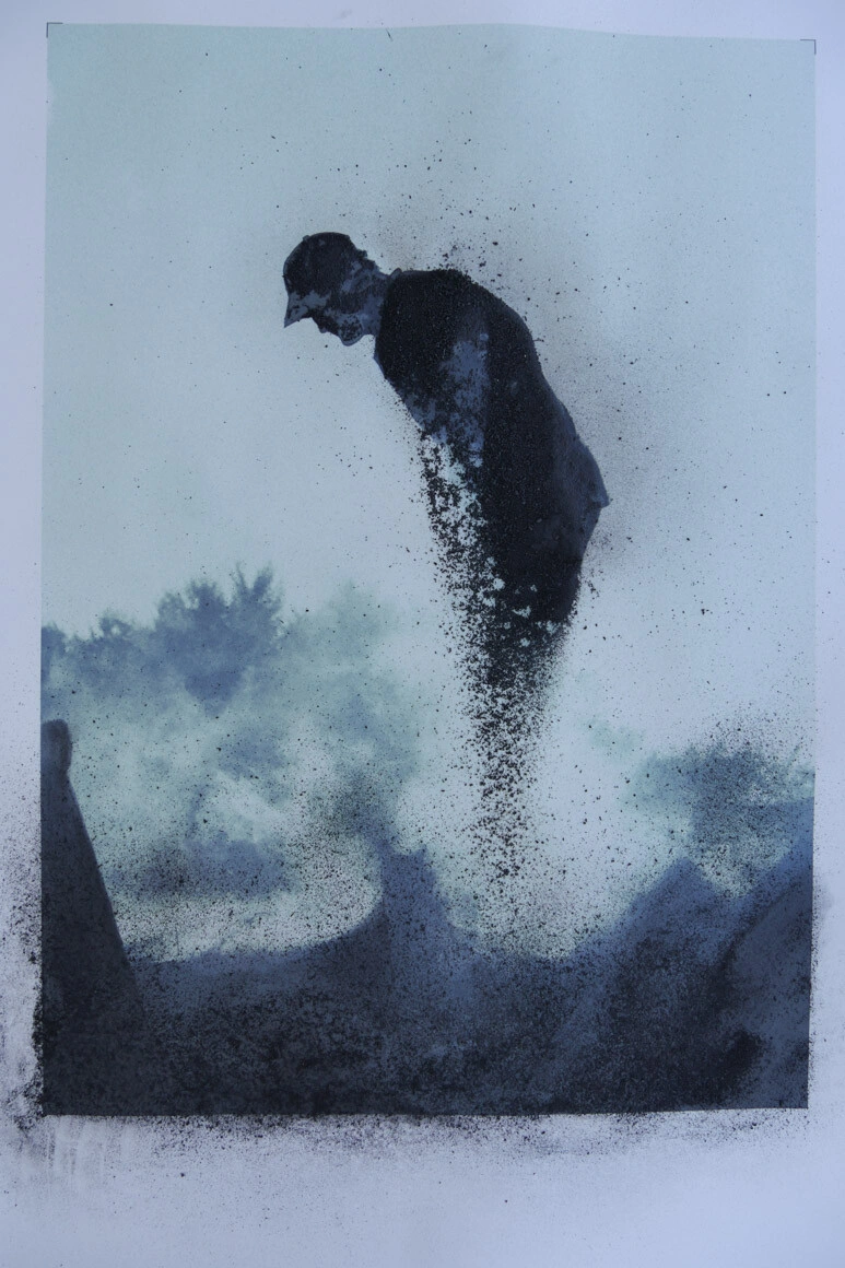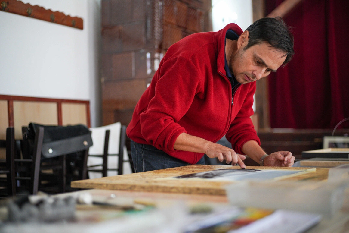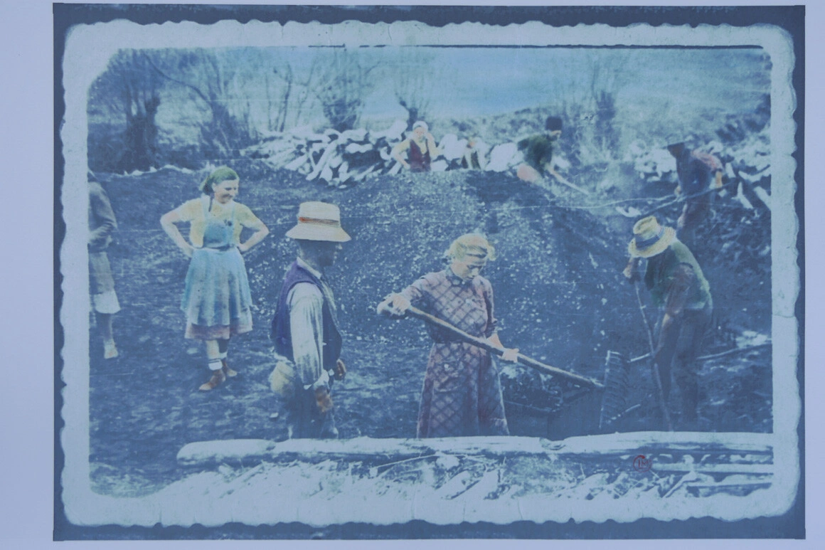 Justinian Scărlătescu, a intervenit cu praf de cărbune și acuarele pe fotografiile documentare cu cărbunarii locali. Primul contact cu cărbunele a însemnat și începutul său ca artist. După doi ani de liceu la profilul real s-a transferat la școala de arte unde primele cursuri au presupus desenul în cărbune. „Fotografiile au menirea de a reda inima, atmosfera locului”, spune Justinian, „iar intervenția cu pulbere de cărbune pe imagini a fost o premieră personală”.