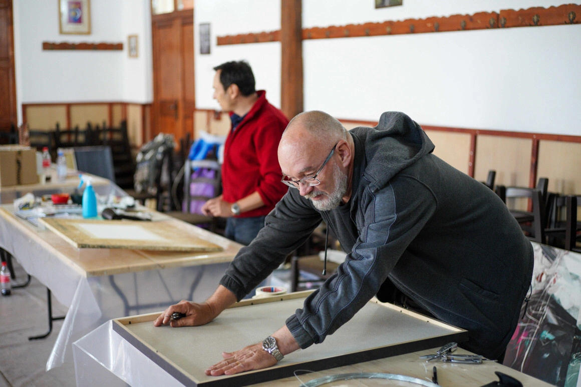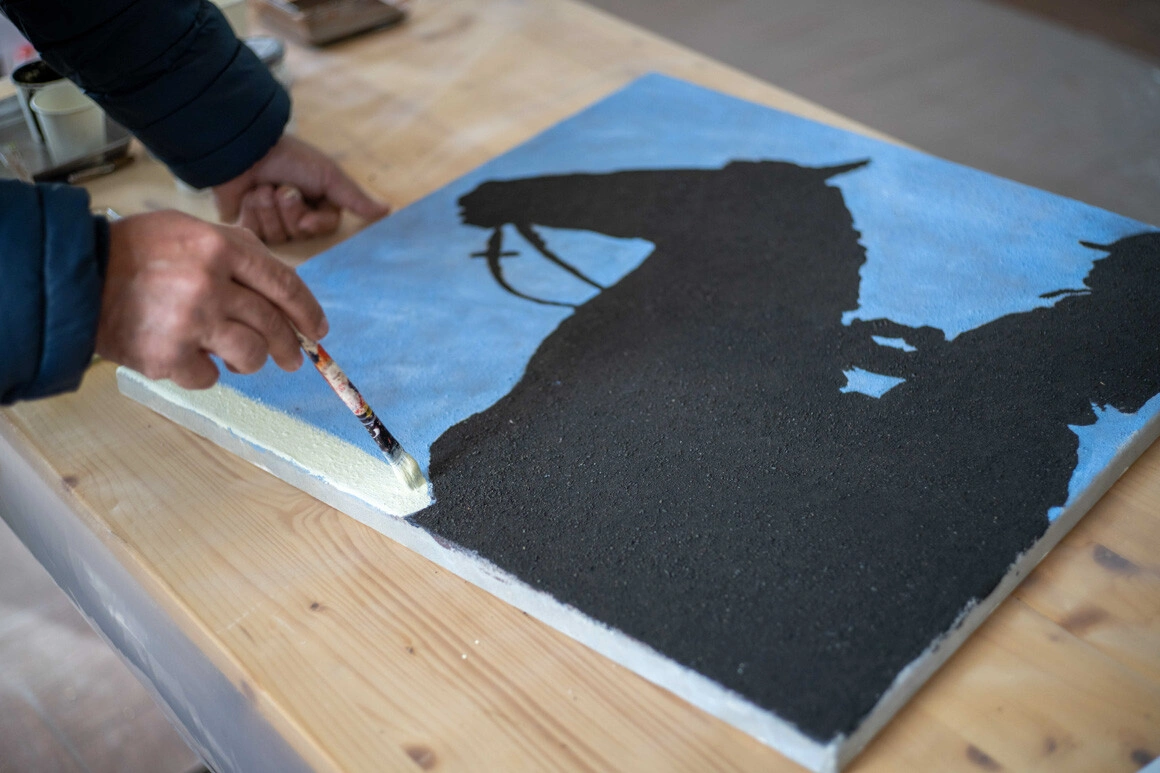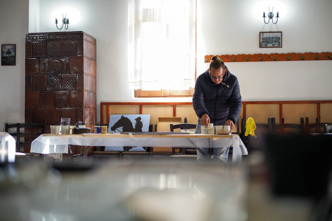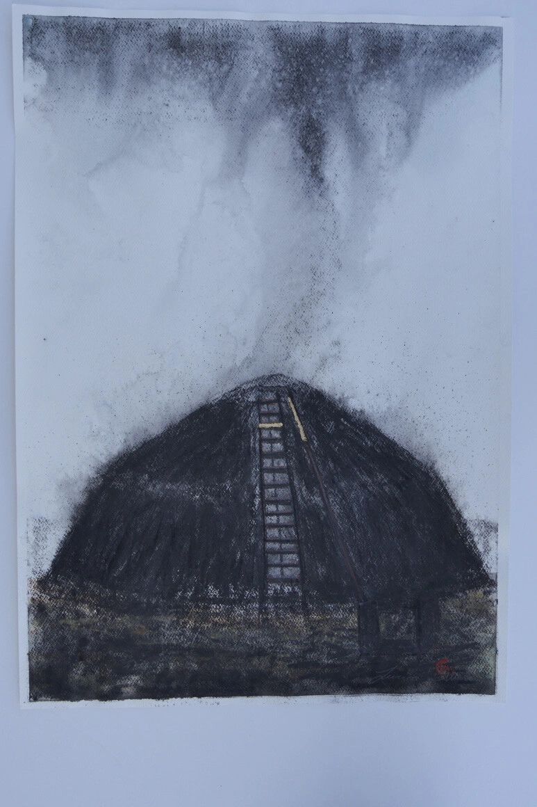 Aurel Tar, artist din București, a folosit cărbunele sub formă de pulbere aplicată direct pe pânză. Mirosul i-a adus aminte de soba din școala primară, care asigura, la vremea respectivă, încălzirea cu cărbune. Ideea tripticului cu cai pe care l-a pictat în zilele taberei i-a venit în timpul vizitei unei herghelii locale. Alăturarea mangalului cu pictura și caii văzuți la apus i-a venit spontan, în timpul documentării prin zona Lupeni.