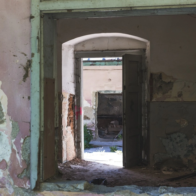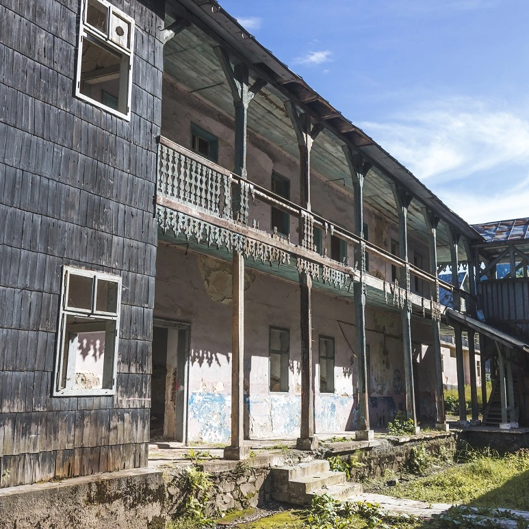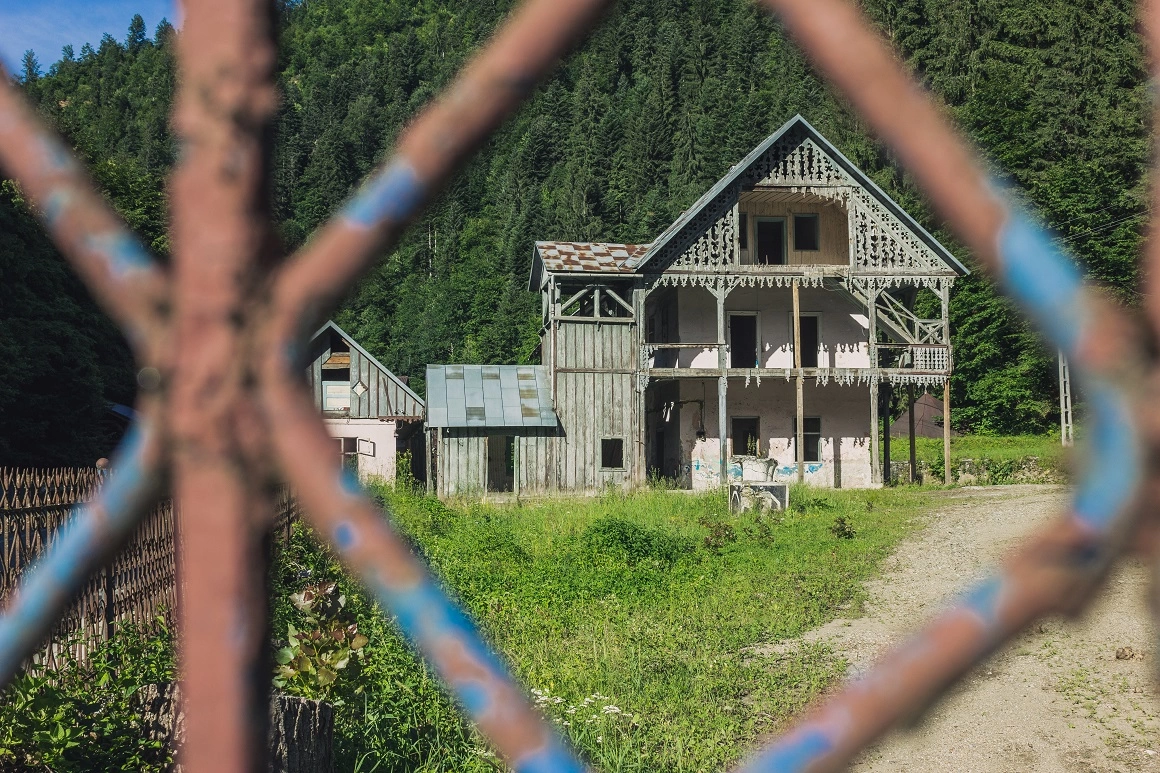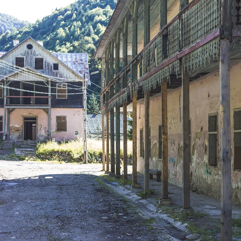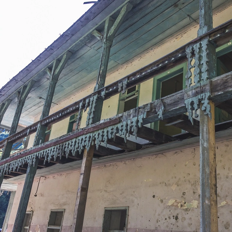 Sar gardul de lemn pus de autoritățile locale și intru în curtea Casei Scriitorilor, acum o ruină, la fel ca atâtea altele prin toată țara. Pereți scorojiți, geamuri sparte, camere pline de moloz și mesaje în spray auto lăsate de copiii din sat. În clădirea principală, deasupra unei uși rupte, cineva a scris „welcome”, și pe un perete exterior „I’m the king”, cu o mică coroană deasupra. Cândva regatul băilor, al conților și-al scriitorilor pare la un cutremur distanță de colaps total. Scările și prispa de lemn de la etajele superioare sunt în mare parte rupte sau stau să cadă.