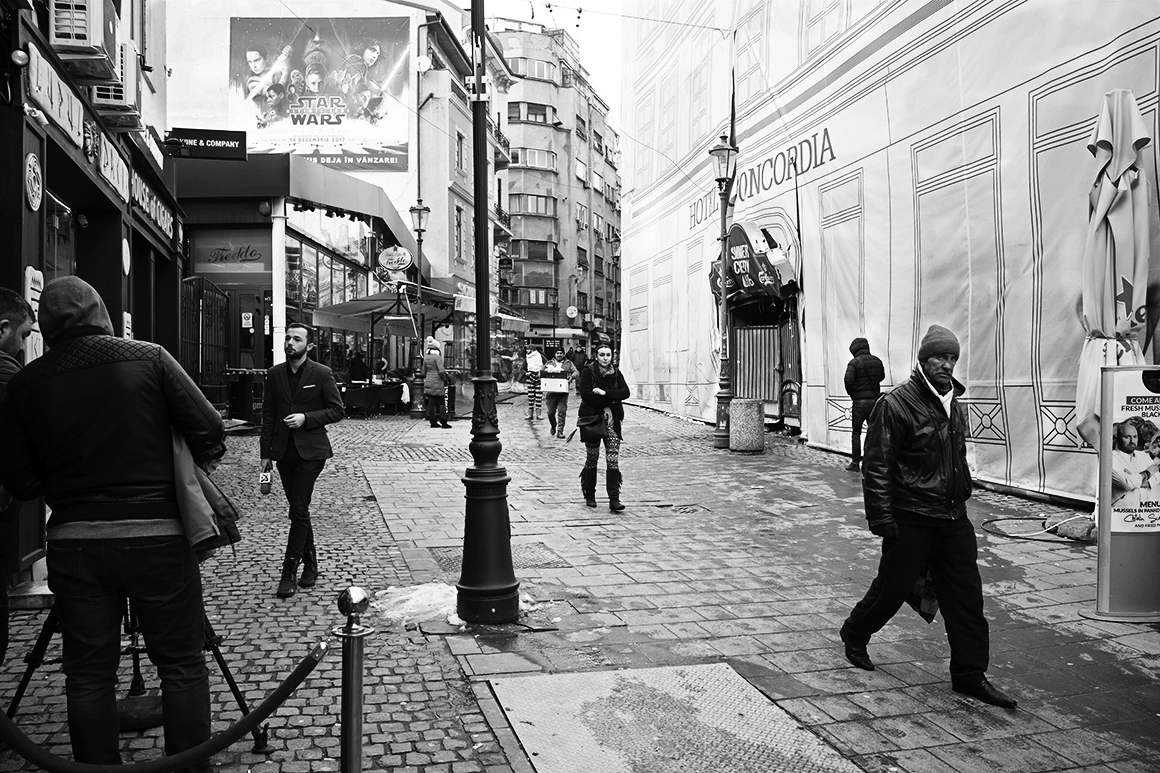 La lumina zilei, strada Smârdan din Centrul Vechi al Bucureștiului n-are cu ce să-și acopere hidoșeniile: un covor roșu murdar ar trebui să îmbie trecătorul la „Girls Live Nude”, iar o construcție strâmbă din sticlă se dă cafenea de lux. Fete înfrigurate le cer trecătorilor să se oprească pentru băuturi calde, dar pe lângă ele trec mai ales oameni bosumflați care cară cutii. La numărul 39 e o clădire ascunsă sub un cearșaf alb pe care-s desenate contururi de ferestre și de uși. Învelișul se despică deasupra intrării, acolo unde scrie mare „Hotel Concordia”. Prin crăpătura porții se vede un gang întunecat, plin de gunoaie.