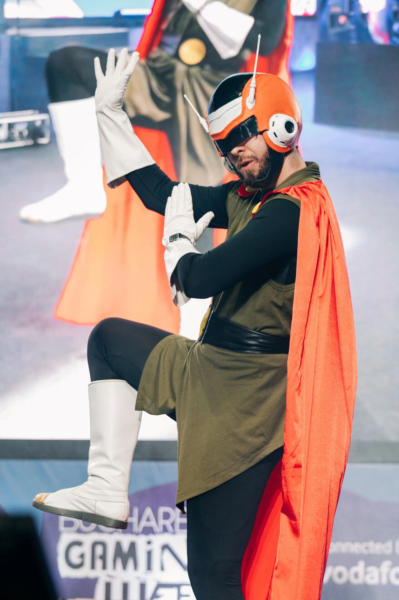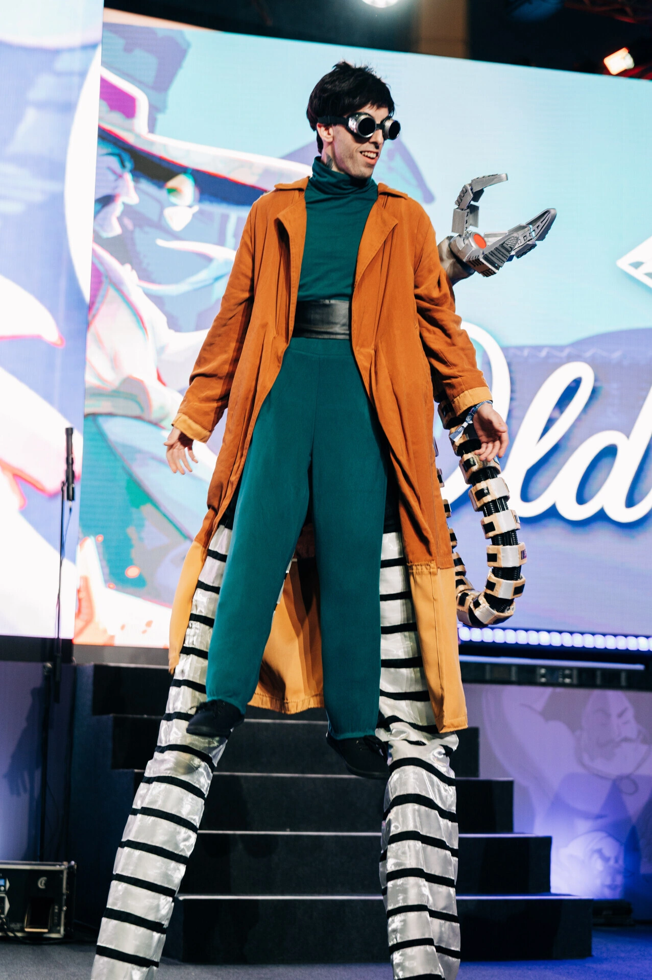 La cei aproape doi metri și jumătate înălțime, Alexandru Carapelea pare făcut pentru scenă. În lumina puternică de la Romexpo, costumul lui de Doctor Octopus domină cadrul: brațele metalice se arcuiesc în spate, ca niște extensii ale corpului, iar ochelarii fumurii completează imaginea unui personaj ieșit direct din universul Spider-Man. Din public, e imposibil să nu-l remarci.