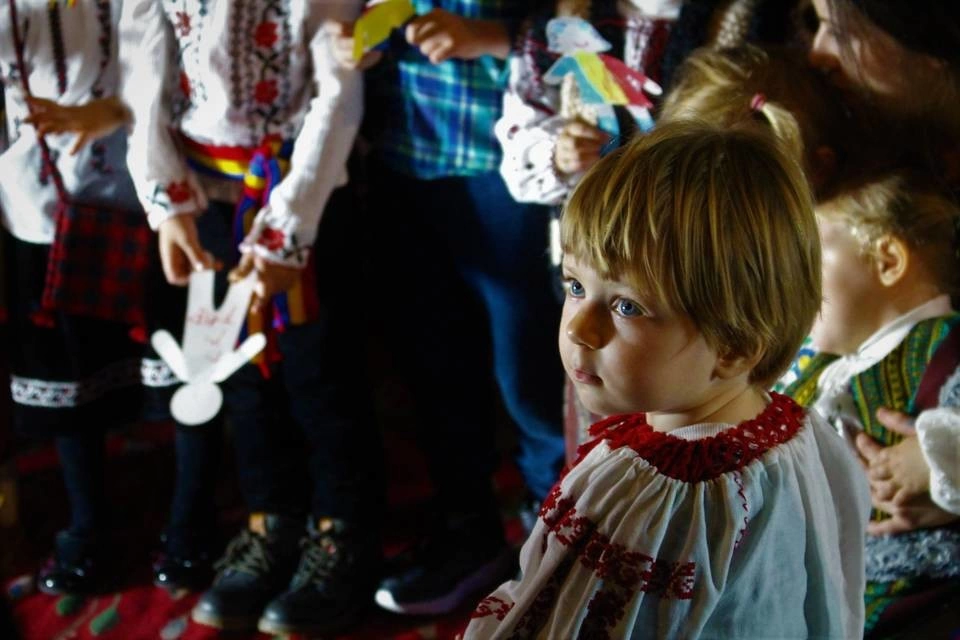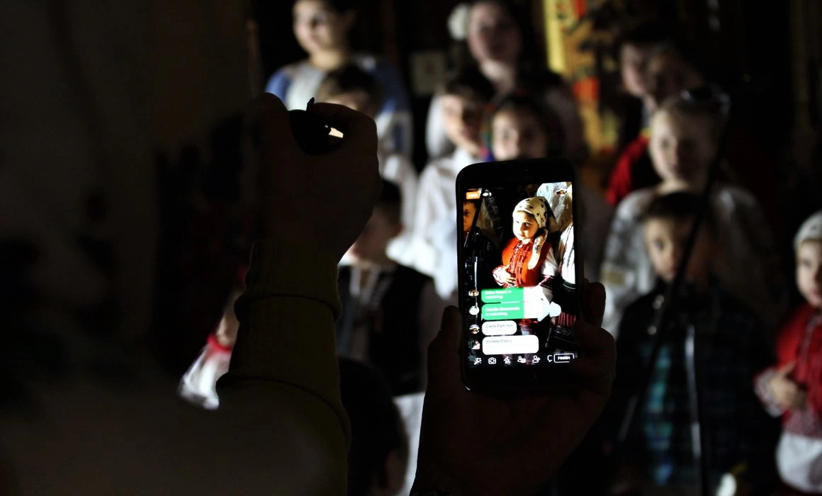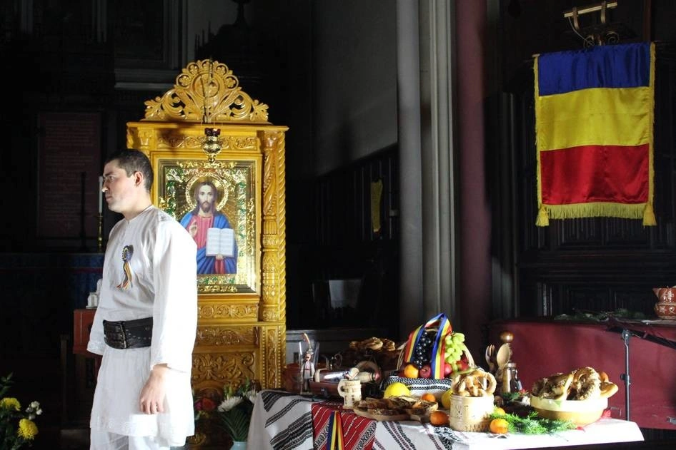 Mai mulți copii recită: „Ce-ți doresc eu ție dulce Românie” de Mihai Eminescu, „Zbuciumat țăran român”, care e un cântec popular interpretat de Daniela Condurache și alte poezii ale căror autor nu-l știu, „Roșu galben și albastru, ce frumos e steagul nostru”. Părinții se înghesuie să le facă poze copiilor. În afara scenei, aceiași copii români se joacă, râd și strigă unii la alții în engleză. Din când în când, un cor de adulți cântă câte ceva, înarmați cu un steag pe care un tânăr îl ține foarte sus în fața altarului, ca la fotbal sau la protest.