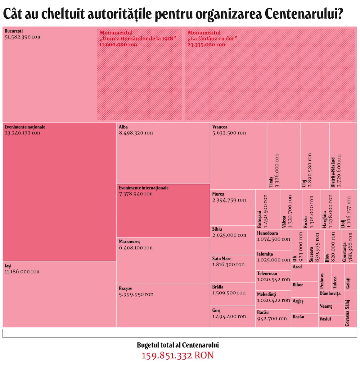 În săptămânile ce-au urmat, inboxul s-a umplut de PDF-uri, Exceluri și fotografii ale unor documente pline de antete, numere de înregistrare, ștampile, semnături peste semnături. Unele instituții n-au răspuns deloc, altele - precum Primăria Capitalei - au răspuns la patru luni după prima solicitare. Reprezentanții unor consilii județene au preferat să trimită mai departe solicitarea către toate instituțiile din subordine, așa că ne-am trezit cu răspunsuri de tipul celui trimis de o grădiniță din Fălticeni, care ne anunța că „nu avem buget alocat pentru activități sau proiecte legate de Centenar. Menționăm că vom desfășura activități legate de Centenar în cadrul activităților extra-curriculare «Școala Altfel»”. Ne-au răspuns și reprezentanții Aeroportului din Bacău, care ne-au asigurat că, deși nici ei n-au buget, vor afișa sigla oficială a Centenarului „în locații vizibile, cu trafic mare de pasageri”. Ceva-ceva tot se face, cum ar veni.