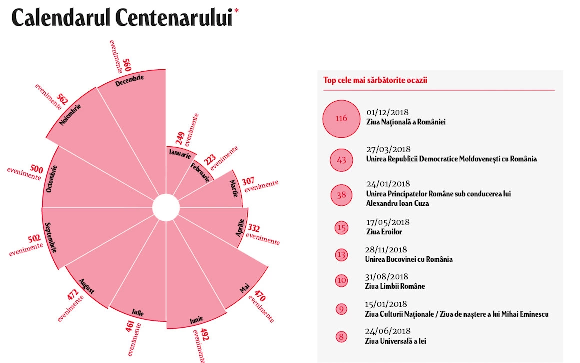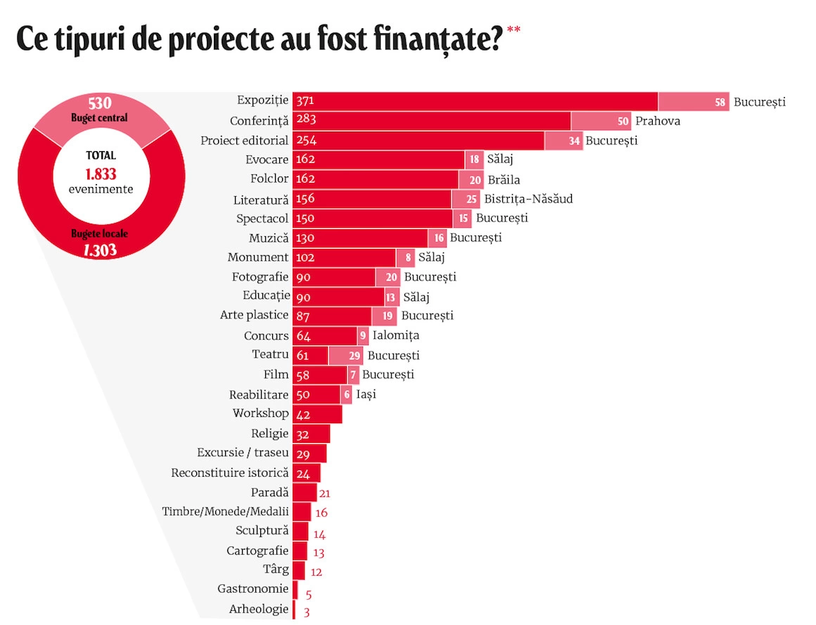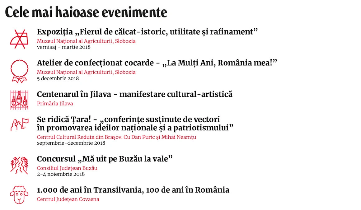 A făcut fiecare după pricepere și după buget. Între altele, sub sigla Centenarului, Muzeul Național al Agriculturii Slobozia a inaugurat, în martie, o expoziție intitulată „Fierul de călcat-istoric, utilitate şi rafinament”, Consiliul Județean Brașov a organizat seria de conferințe „Se ridică Țara!”, „susținute de vectori în promovarea ideilor naționale și a patriotismului” precum Dan Puric și Mihai Neamțu, Complexul Muzeal de Științele Naturii „Ion Borcea” din Bacău a organizat evenimentul „Cânepa - trecut, prezent și viitor”, iar Primăria Capitalei a cheltuit 430.000 de euro pentru trei reprezentații ale spectacolului de teatru „Vlaicu Vodă” și a susținut un proiect ce-și propune „implementarea unei functionalități de tip AutoCorect într-o extensie Google Chrome pentru a semnaliza greșelile de scriere în timp real”.