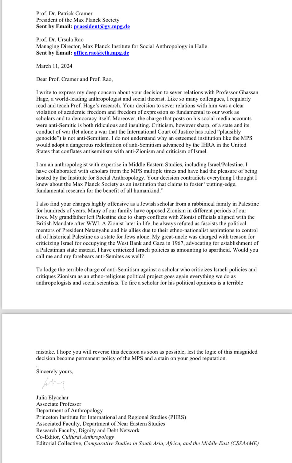 Institutul Max Planck a răspuns printr-un mesaj general la toate scrisorile de susținere, argumentând că a existat o lungă istorie în care Ghassan Hage a fost rugat să o lase mai moale cu postările pe social media pentru a „îndeplini standardele instituției”, iar acesta nu s-ar fi conformat. „Am răspuns public că nu au existat astfel de discuții în trecut. Este complet fabricat”, mi-a spus Ghassan Hage. Acesta a atacat în instanță decizia Max Planck Society de a-l da afară.