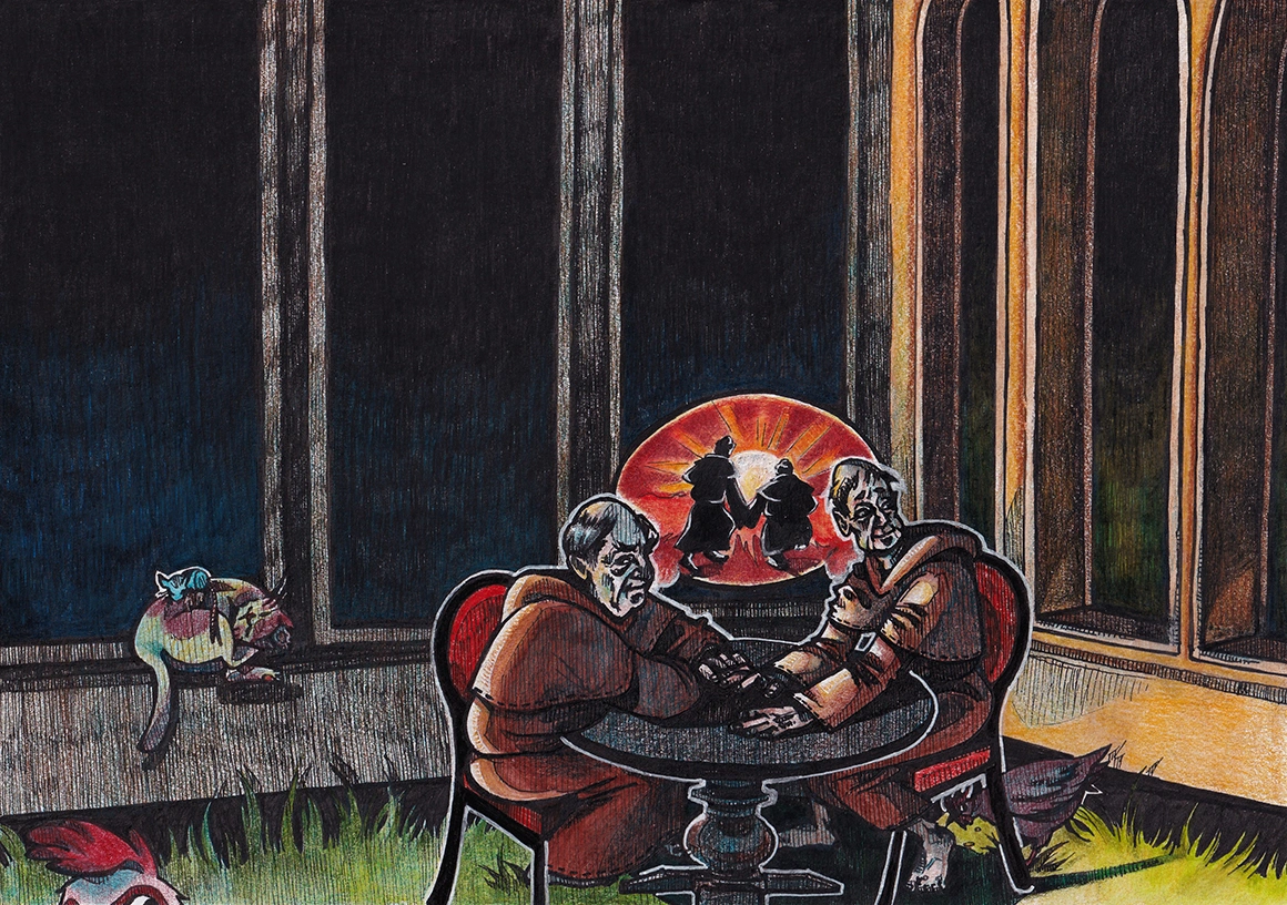 Călugărul Lazzaro stătea la o masă rotundă, iar călugărița Rosa era absentă. De cealaltă parte a mesei era un călugăr benedictin. Se numea Benedetto. Scena se petrecea în curtea unei abații, într-un pavilion. Găinile ciuguleau boabe de porumb. Un șoarece dormea pe spinarea unei pisici care torcea la soare. Lazzaro și Benedetto aveau mâinile pe masă și le întindeau astfel încât să-și atingă vârfurile degetelor.