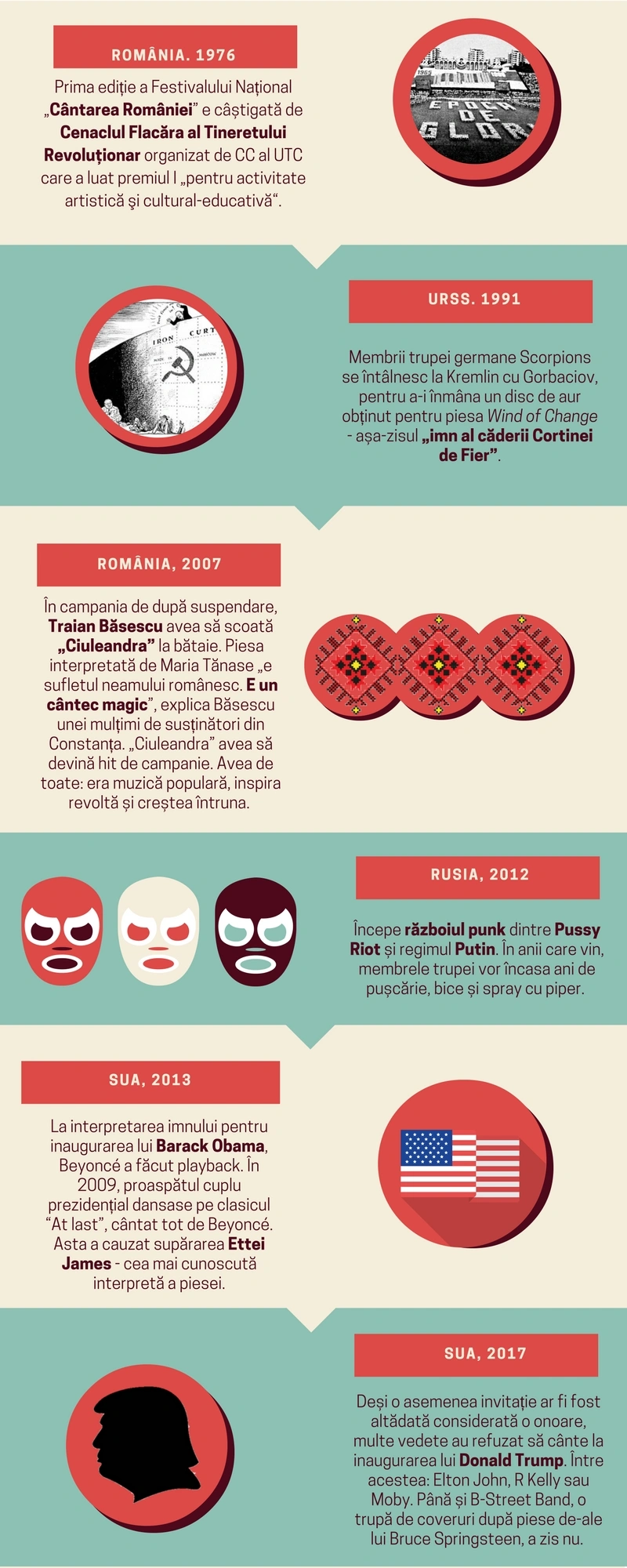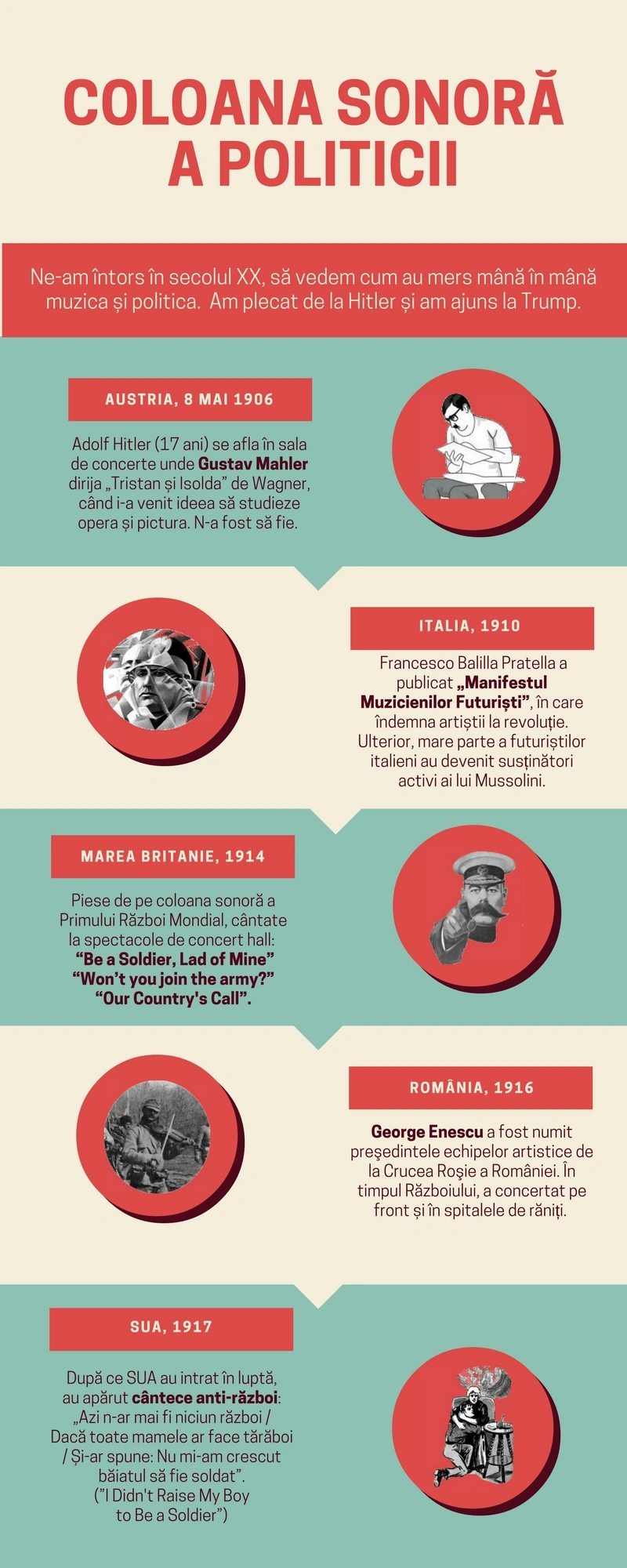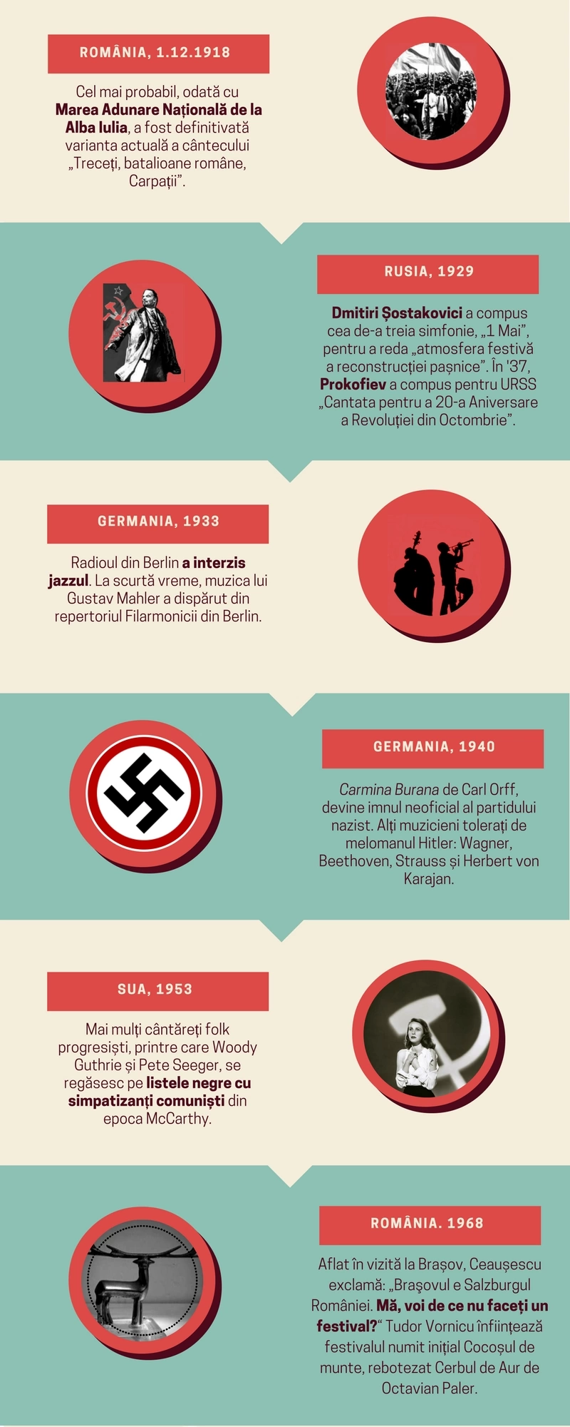 De-a lungul ultimului secol, muzica și puterea au avut o legătură complicată. Pe de o parte, politicienii au încercat mereu să-și îngroașe vocile cu ajutorul artiștilor vremii, să-i transforme în coloană sonoră pentru propria măreție. De cealaltă parte, numeroși muzicieni au constatat că au forța să creeze sau măcar să susțină mișcări de protest prin piesele lor. Am încercat să ilustrăm câteva momente importante din această istorie și să închegăm un playlist pe alocuri grandios, pe alocuri deranjant, cu de toate.