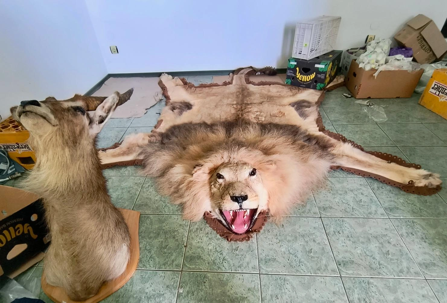 Peste tot pe podea sunt capete de lei dezmembrate și covoare din piele de tigru.