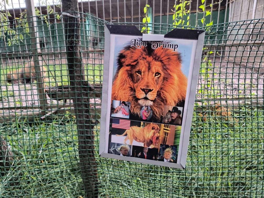 Pe un poster din fața unei cuști de leu e colaj cu lei din grădina zoologică și președintele SUA, cu părul lui portocaliu fluturând în vânt ca o coamă de leu. Titlul spune „Lion-Trump”. Câțiva metri mai încolo se află un alt colaj care îl arată pe președintele Rusiei în camuflaj, mângâind un tigru întins, posibil mort din cauza unei răni prin împușcare. Titlul: „Tiger-Putin”.