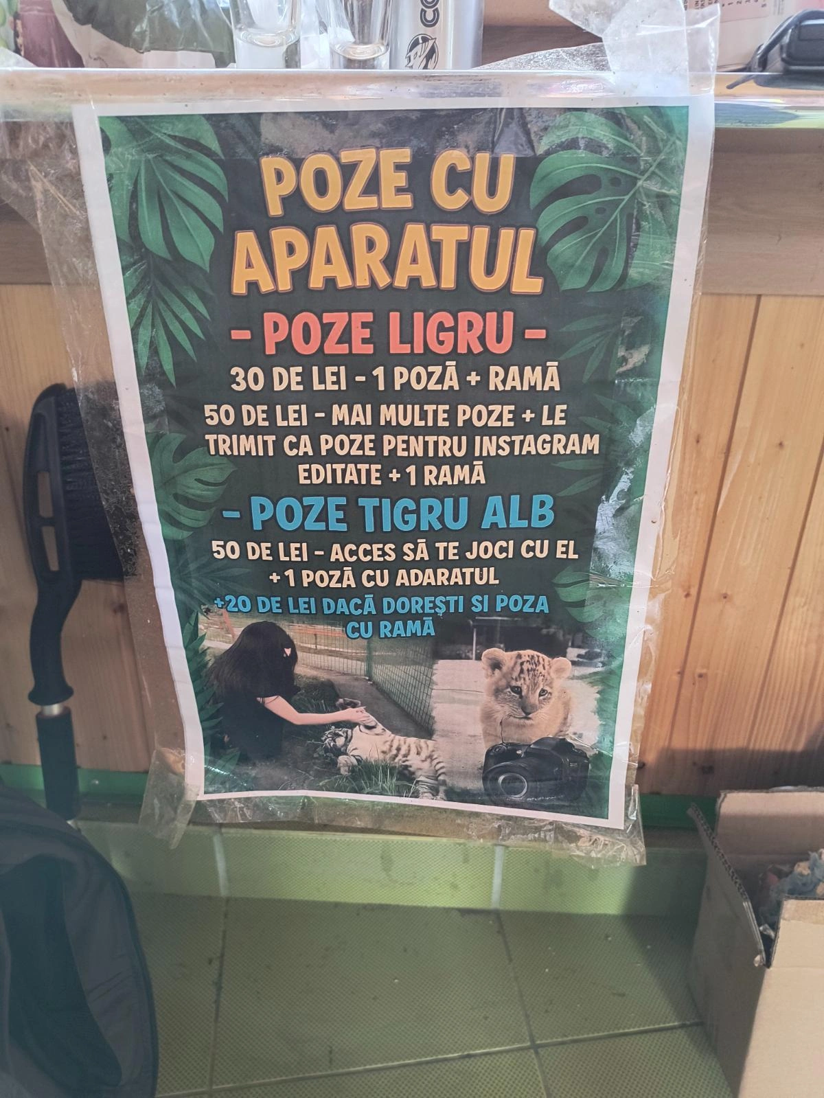Un afiș indică 30 de lei pentru o poză cu ligrul în ramă și 50 de lei pentru o poză cu un tigru alb și „acces să te joci cu el”. Majoritatea vizitatorilor plătesc 20 de lei pentru o poză făcută cu telefonul propriu.
