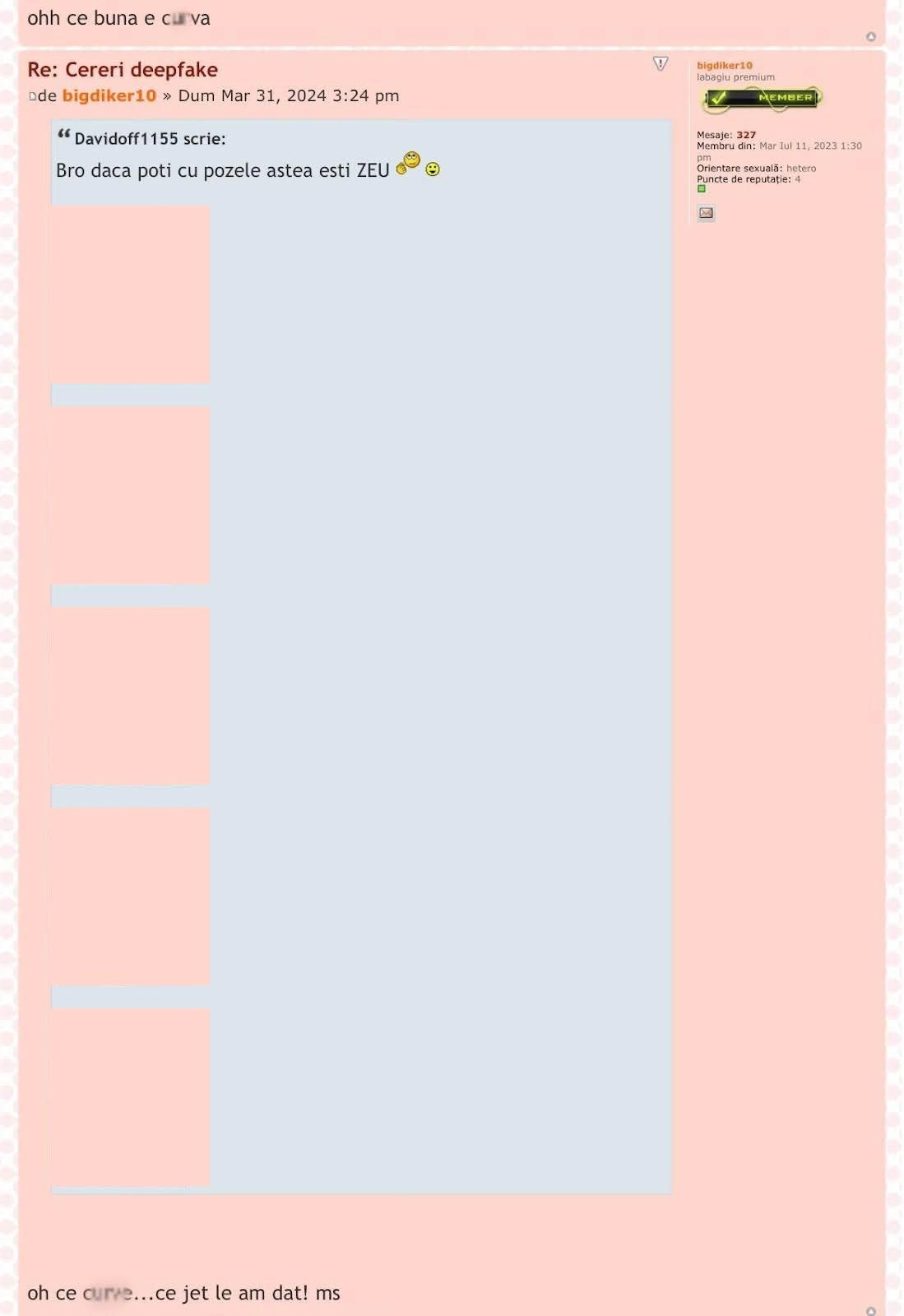 În thread-ul numit „Cereri deepfake” există 234 de postări. Aici le centralizează, pentru că bărbații solicită nuduri cu femei aproape în fiecare thread. Cei care produc conținutul cerut sunt, de cele mai multe ori, utilizatorii xrayman sau mrdeepfake. Dacă cineva își dorește să dezbrace o femeie cu ajutorul inteligenței artificiale, ei îl ajută să o facă pe gratis. Primul a scris într-un mesaj că lucrează cu un program apărut în 2022*, care convertește textul în imagine și este folosit pentru a crea fotografii cu ajutorul inteligenței artificiale.