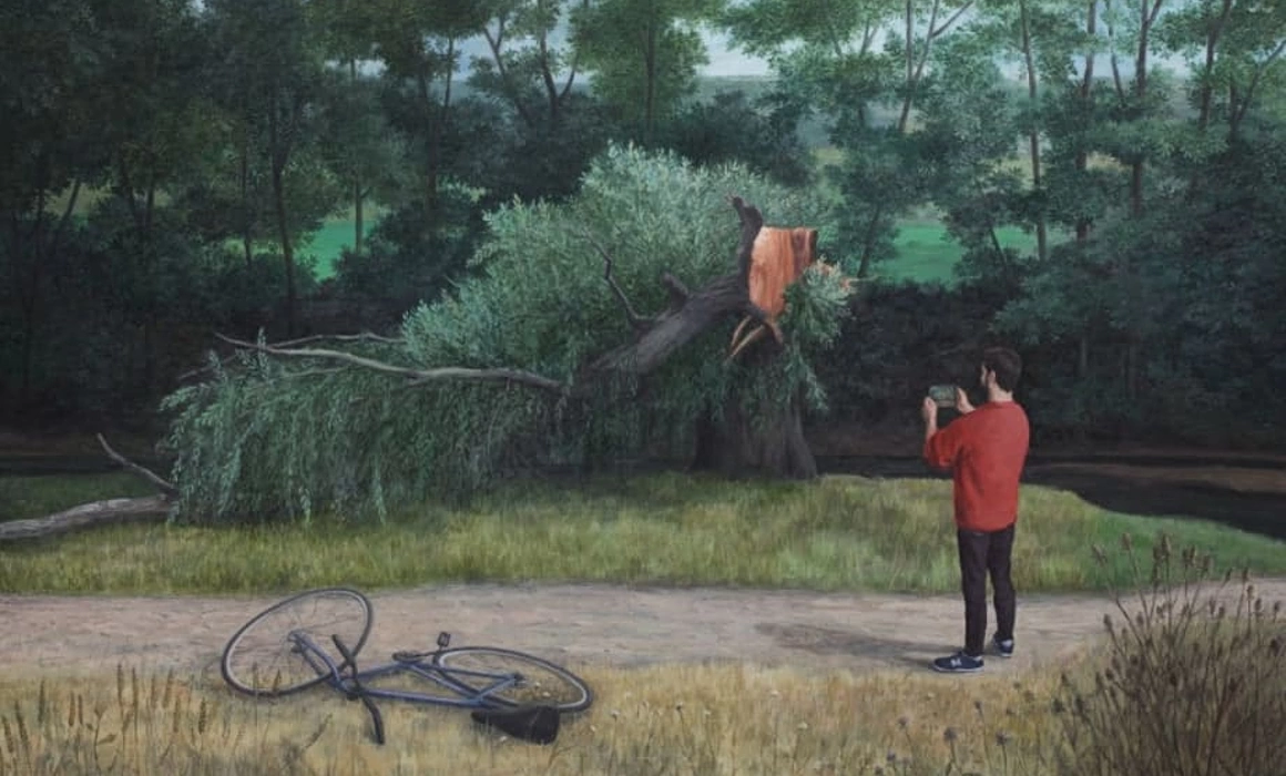 Să începem de la copertă. Nu e o întâmplare că poetul a ales această pictură de Șerban Savu. În primul rând, același Alex Văsieș a folosit două picturi de-ale lui Savu pentru coperțile cupletului editorial Instalația și Oana Văsieș (Charmides, 2016). Neîndoielnic că Dani Coman face cu ochiul în direcția acestor apariții. Dar ideea mea e alta. În al doilea rând, pictura „The Weeping Willow” din 2018 nu este nici mai mult, nici mai puțin decât o punere în abis a esteticii postdouămiiste. Putem observa un personaj care face o poză cu smartphone-ul unui copac rupt din pădure. Bicicleta aruncată lângă trunchi ne face să ne gândim că acest individ s-a oprit din drum ca să surprindă acest cadru „natural”: cu alte cuvinte, numai spontaneitate nu este în acest gest simili-artistic. Savu face o trimitere ironică la practicile noilor tehnologii „filtrate” prin social media: acelea de reprezentare mediată a cotidianului, de captare artificială a imanenței. (Nu e nicio jenă: și eu am postat la rândul meu pe Instagram poze cu scări dărăpănate de bloc sau cu arbori mai câș.) Într-un fel, tot astfel de cadre revelatoare caută și postdouămiismul: imanențe care să ne dea impresia că ne aflăm într-un videoclip sau într-o instalație. Dacă autorii din anii 2000 își făceau autobiografia la modul narativ, postdouămiiștii sunt imersați în anumite segmente atmosferice din cotidianul lor.