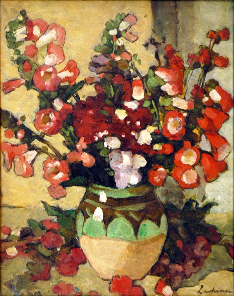 O natură moartă cu flori mai înseamnă și multă culoare lipită pe un suport. La Luchian, culoarea nu mai e doar ilustrație, doar textură sau doar obiect, ea merge liber, e „vopsea colorată”, devine câmp de culoare și vorbește de multe ori strict despre sine.