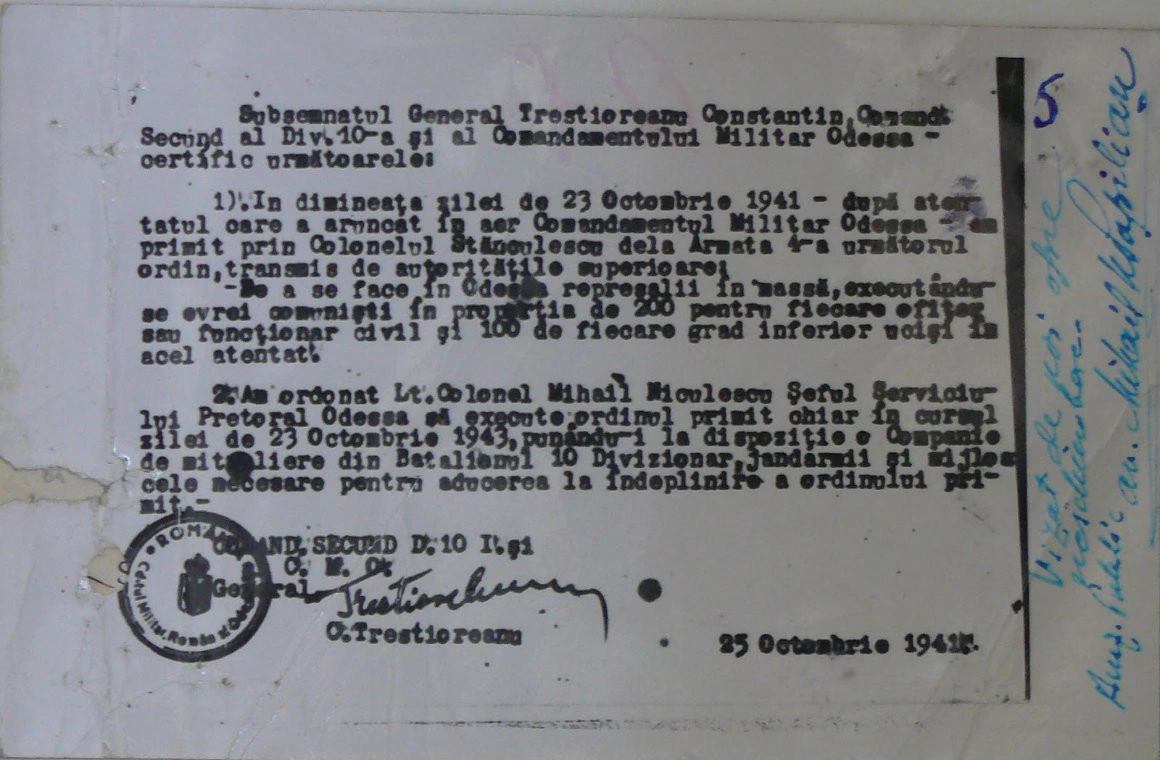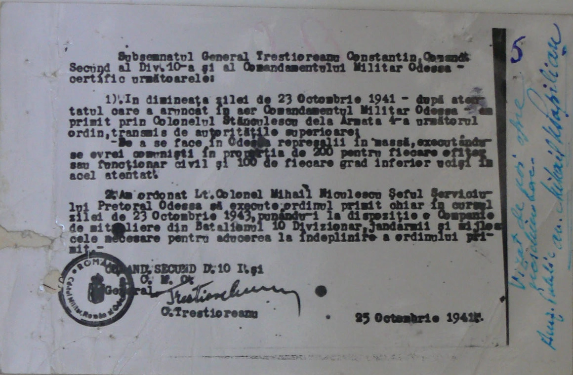 2) Toți indivizii care intră în prevederile ordinului 3161 (302 858) din 23 Octomvrie 1941 care nu au fost încă executați, precum și alții ce li se pot adăuga vor fi puși într’o clădire minată anterior și care va fi detonată. Se va efectua această acțiune în ziua înhumării victimelor noastre.