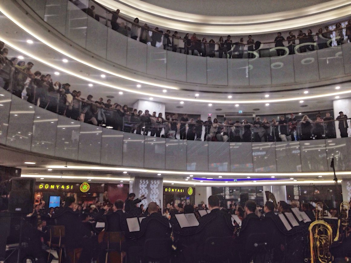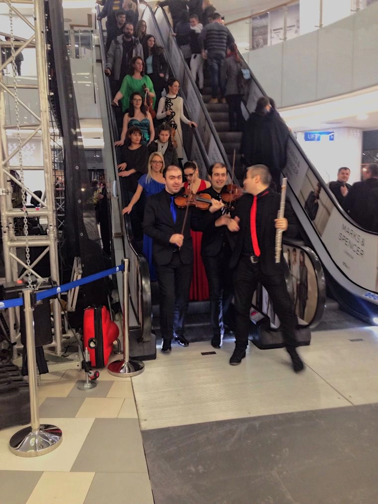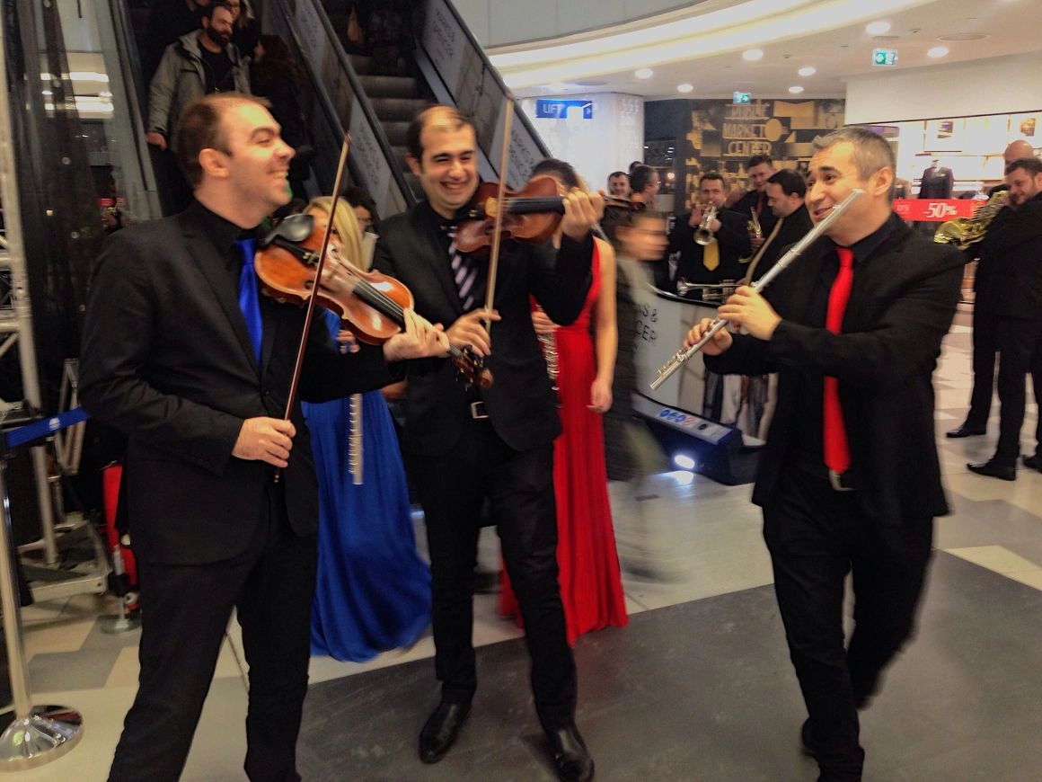 Cât am făcut un tur al mall-ului și m-am pierdut, orchestra a dispărut. Scaunele-au rămas goale și câțiva oameni în așteptare. Oare muzicienii se duseseră să mai prindă ceva din Assasin’s Creed la Movieplex sau să bage nişte aripioare picante? Am ieșit să mă plimb cu întrebările astea-n minte și m-am întors cu zece minute înainte de concert. Muzicienii forfoteau acum cu instrumentele printre oameni și prin magazine, stăteau la poze, cântau pe scările rulante. Unul a intrat cu partenera lui și c-un arcuș în mână într-un magazin cu lenjerie intimă. Au inspectat sutiene și-au ieșit criticând calitatea lor. Totul era jovial, informal, nu era atmosfera aia solemnă, cu dress code şi statut, dintr-o sală clasică de concerte simfonice.