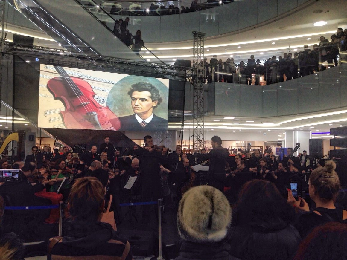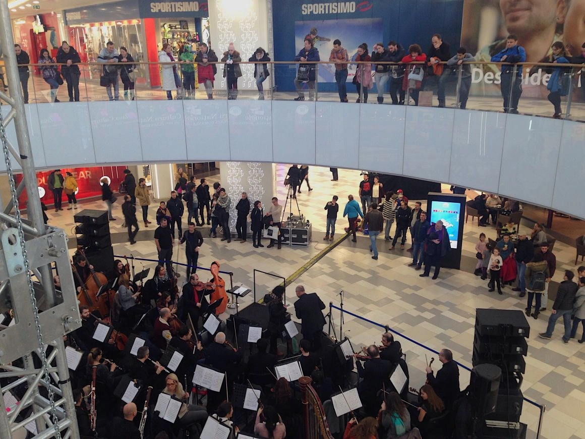 Apoi, o voce i-a anunțat pe shopper-i în difuzoare că va începe un „concert extraordinar”. Muzicienii și-au luat pozițiile pe scaune și-au făcut să răsune o oază de românitate într-o mare de branduri occidentale. Ochiometric, erau vreo 200 de oameni în public, pe trei niveluri. Nivelurile de sus păreau niște loje îndepărtate dintr-o sală de spectacol. Rapsodia nr. 1 a lui Enescu a planat peste sutienele de proastă calitate, importate de cine știe unde, însoțită de-o poză alb-negru cu marele compozitor român, care era proiectată pe un ecran mare. Apoi, soprana a venit la microfon să recite ceva din Eminescu. „Peste vârfuri, de Mihai Eminescu: (...) De ce taci, când fermecată inima-mi spre tine-ntorn?”.