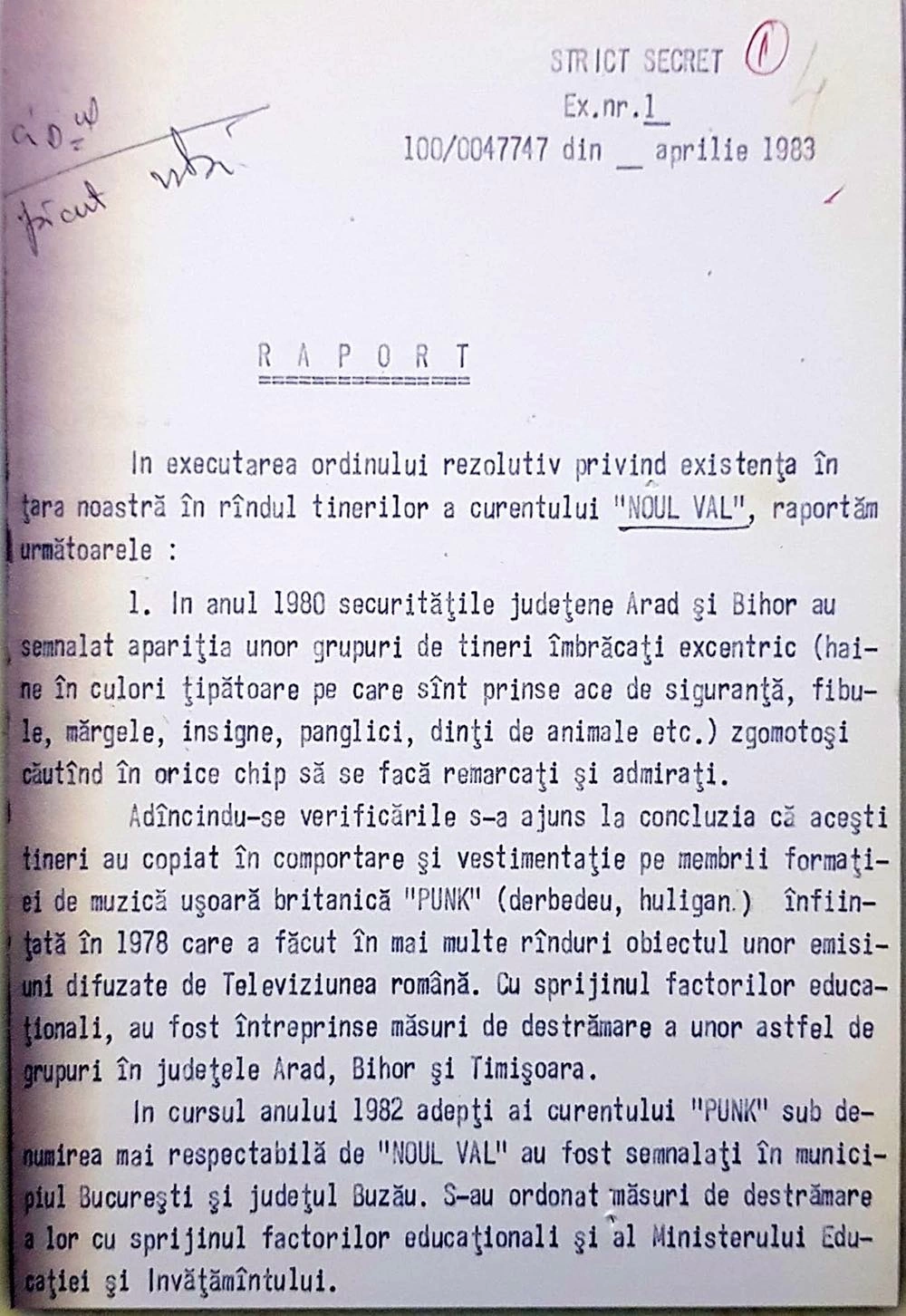 În umbra acestor lipsuri, Securitatea se chinuia să înțeleagă și să astâmpere nemulțumirile oamenilor, deși pe prima pare că o făcea destul de ineficient. Într-un alt raport din 1983 este descris comportamentul unor tineri care „au copiat în comportamente și vestimentație pe membrii formației de muzică ușoară «PUNK».” Aceeași notă semnalează că „în cursul anului 1982 adepți ai curentului «PUNK» sub denumirea mai respectabilă de «NOUL VAL» au fost semnalați în municipiul București și în județul Buzău.”
