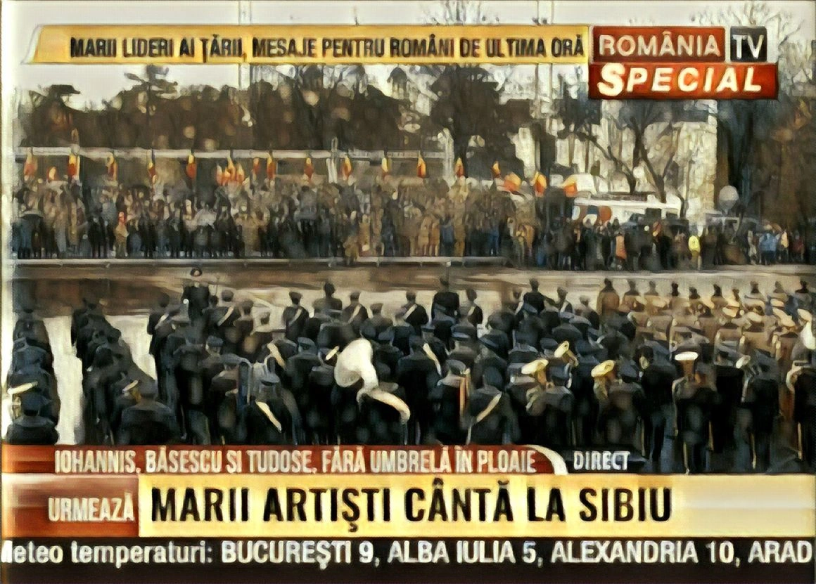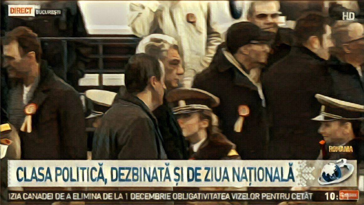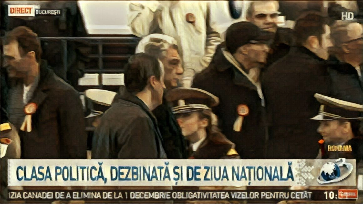 În dimineața morocănoasă de 1 decembrie, jurnaliștii TV s-au adunat disciplinați la Arcul de Triumf, ca să transmită imagini spectaculoase de la parada militară programată pentru ora 11. Unele televiziuni au venit cu vreo două ore mai devreme, să intre în atmosferă. Am nimerit cu telecomanda pe posturile de știri care-au făcut o carieră din boscorodit. La Antena 3 și România TV se discuta despre cât de uniți sunt românii, dar cât de dezbinați sunt politicienii. Zeci de minute de rememorat scandaluri politice care-au marcat zilele naționale anterioare, dar și de pronosticuri privind componența tribunei oficiale și lista de participanți de la recepția prezidențială de seară. Unii jurnaliști, mai meteosensibili, simțeau chiar și o apăsare, o tensiune în atmosferă, ce venea tocmai dinspre publicul spectator: Oare se va huidui și anul acesta? Ar fi păcat, dar de înțeles!