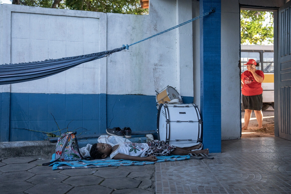 Pe o terasă, câteva trepte mai sus, un băiat doarme cu fața în sus pe o pătură cadrilată, în nuanțe de albastru-cer și gri. Lângă el, o pereche de șlapi și un rucsac. Piciorul stâng i se sprijină de toba mare albă, pare ca prins sub greutatea acesteia. La câțiva metri, pe o saltea pătată de timp, subțire, alți doi copii dorm adânc, deloc deranjați de agitația din jurul lor. Cea mai mică este o fetiță de cel mult doi ani. Poartă o rochiță ce imită costumul Femeii Fantastice (Wonder Woman), iar pe sub fustă i se vede scutecul, imprimat cu ursuleți.