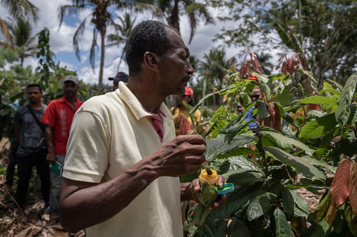 Aproximativ douăzeci de oameni stau retrași sub copaci mici, la adăpost de soarele arzător. În mijlocul lor, un bărbat într-un tricou roșu cu sigla MST le explică cum, la fel ca și ei, planta de cacao are nevoie de umbră. Printre elevi se numără Arles, o tânără din Brigada Nelson Mandela. „Vreau să învăț cum să lucrez cu boabele de cacao”, spune ea. „Despre sistemul de clonare, care are un risc mai mic de boli sau dăunători.” Clonele sunt produse prin altoirea mugurilor. Au randamente mai mari decât hibrizii și rezistă mai bine la boli. „Apoi îl aplicăm pe lotul nostru din așezarea Bela Manhã. Așa că, când mă întorc acasă, voi planta palmieri, iar șase luni mai târziu pot planta cacao.”
