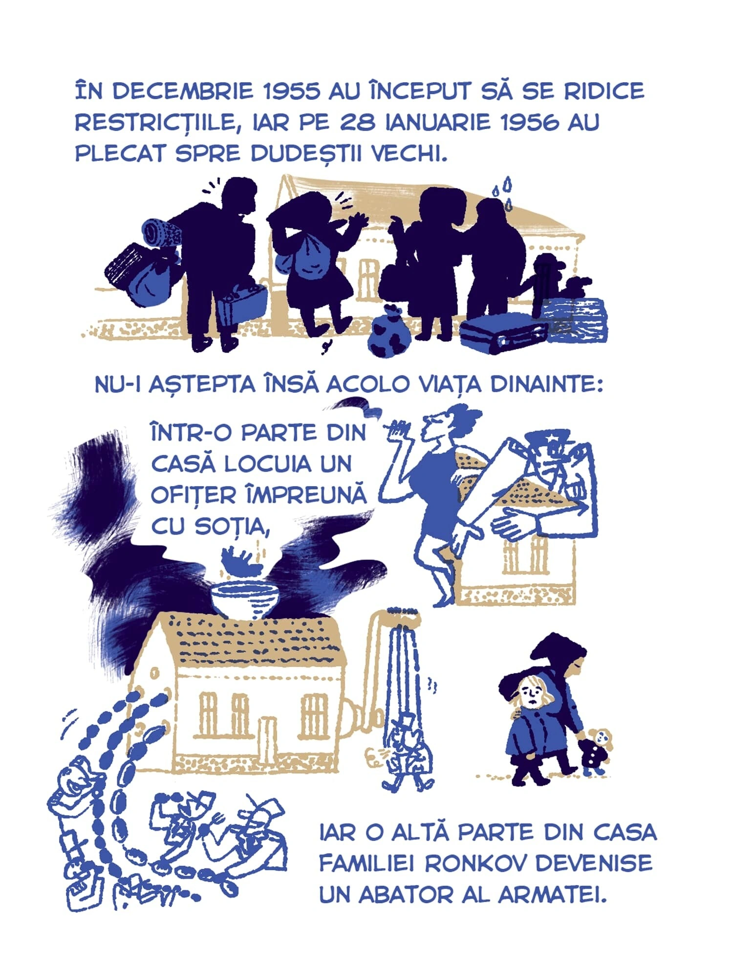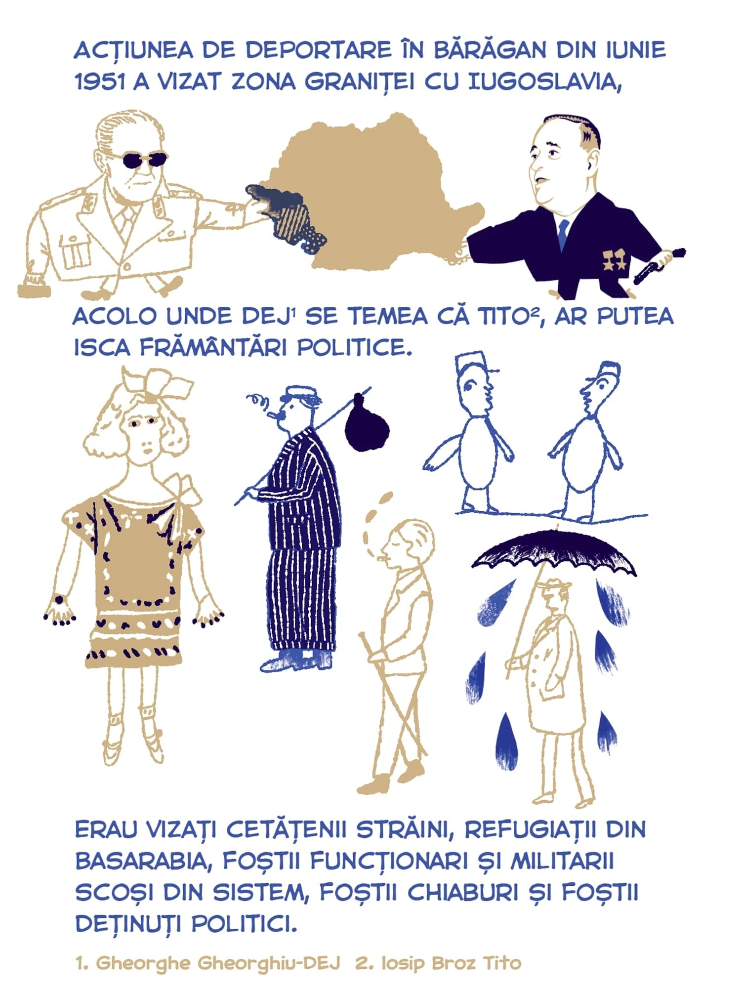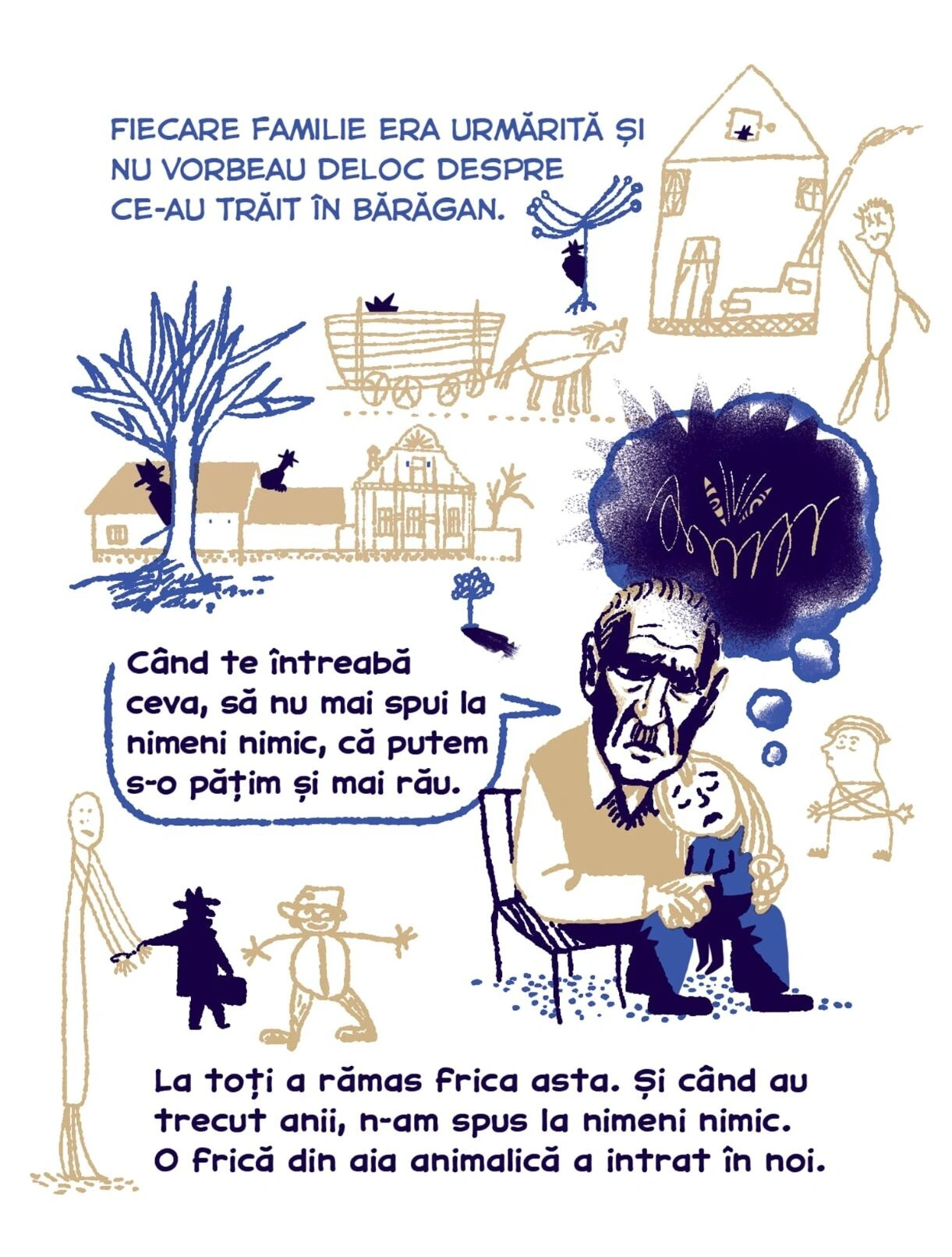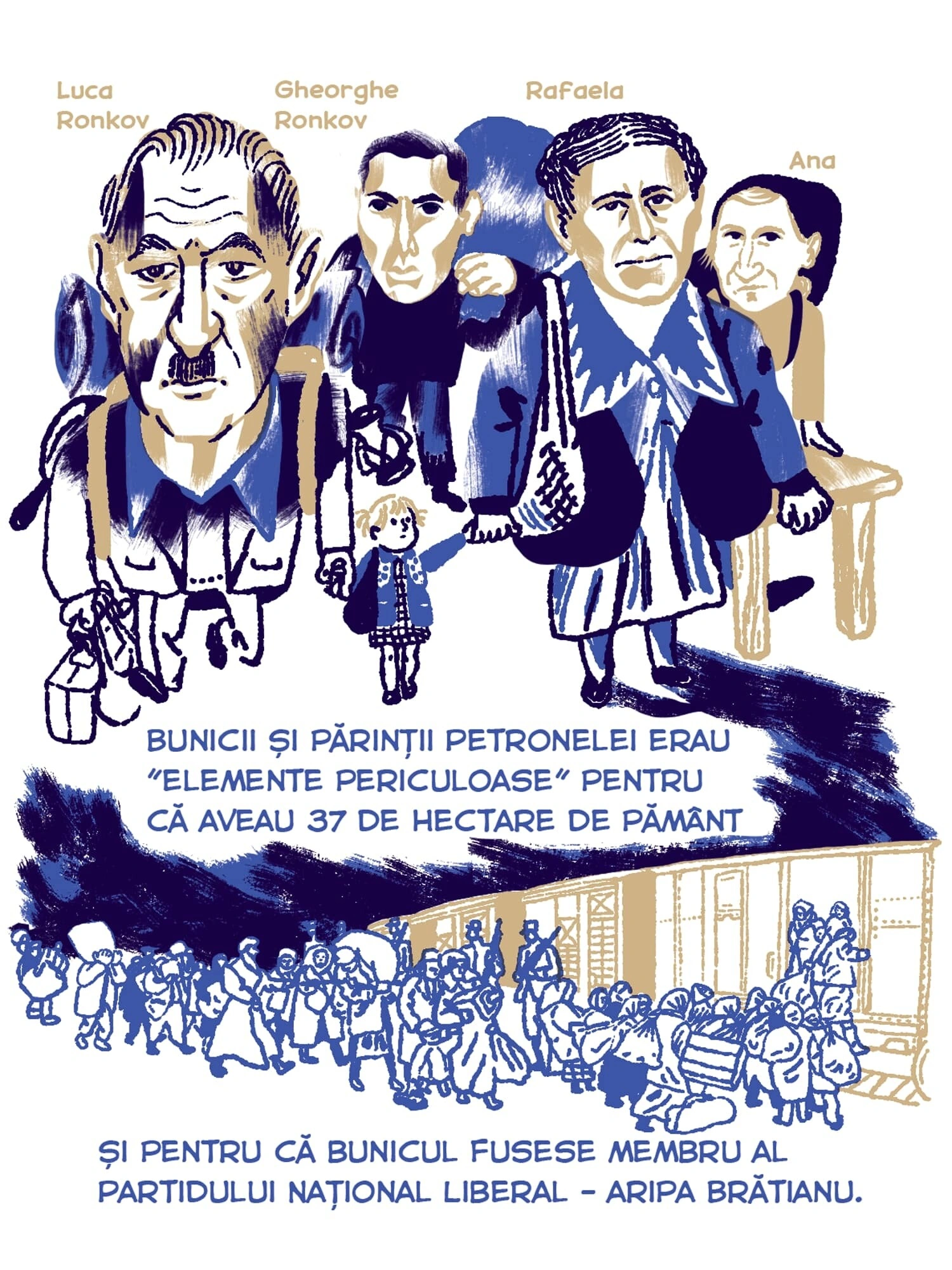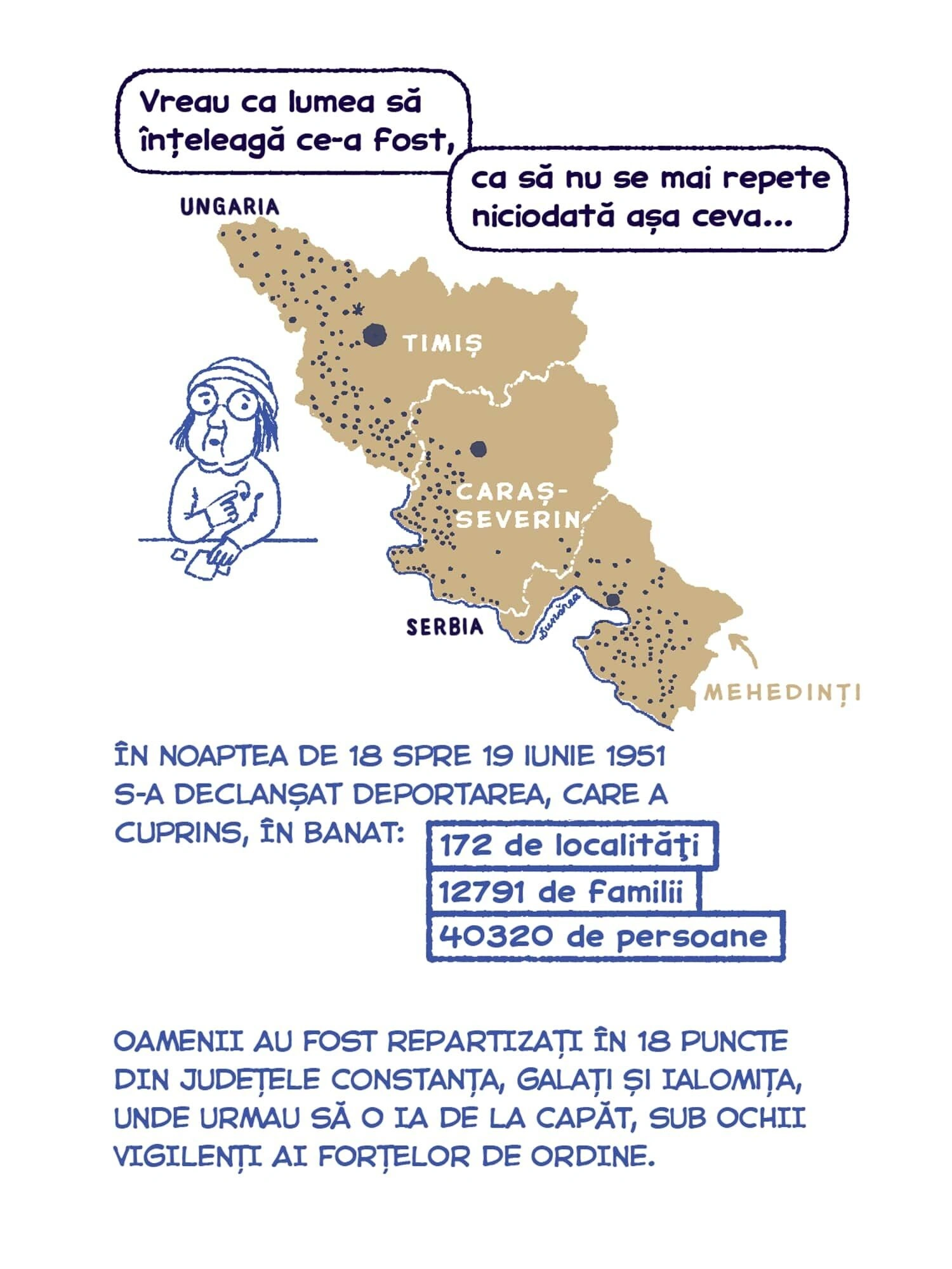 Continuăm seria de benzi desenate Tur Banat cu o poveste despre deportări, bazată pe documentarea jurnalistului Vlad Odobescu. Petronela Tămaș avea patru ani în 1951, când a fost deportată în Bărăgan, alăuri de familia ei. Ca ei au mai fost câteva zeci de mii de locuitori din vestul țării, pe care Gheorghe Gheorghiu-Dej i-a mutat cu forța în celălalt capăt al țării, de teama unor posibile neliniști politice. Sorina Vazelina a ilustrat bucata asta de istorie, așa cum a traversat-o Petronela, care a cunoscut încă din copilărie nesiguranța și frica, pe care regimul comunist și sistemul lui de securitate au transformat-o într-o armă de control în masă.