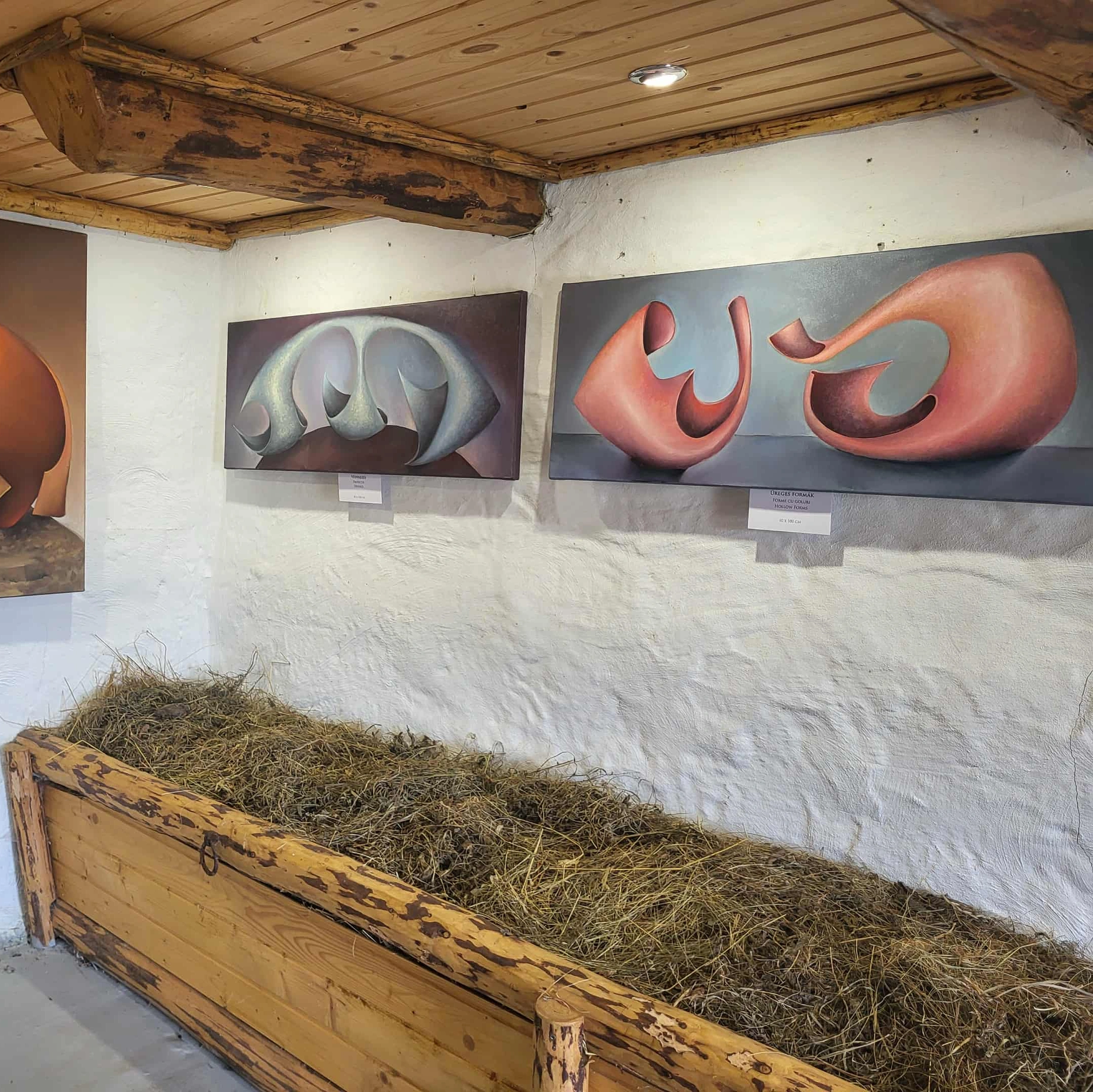 Deasupra ieslei, în care sunt puse cu grijă curatorială paie, sunt aliniate tablourile pe care le-a pictat iarna trecută. Forme geometrice, fructe și goluri legate în culori blânde. Abstract și natură. Vinczeffy László, 80 de ani, a fost restaurator la muzeul din Sfântu Gheorghe. În oraș, mai vinde din tablouri uneori, soția se ocupă mai mult de asta.