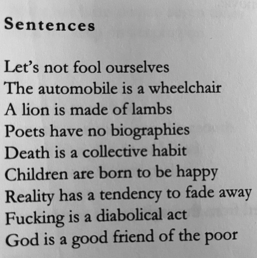 Și poezia anului meu, scrisă de un contrarian chilian (Nicanor Parra, 1914–2018), în original și-n traducere în limba engleză. (Furată, așa cum se cade, de la Bianca Oanea, pe care vă somez să o citiți pe Substack.)