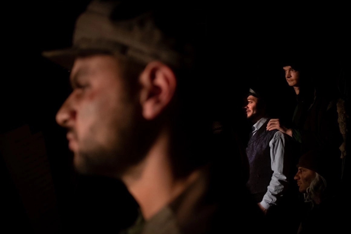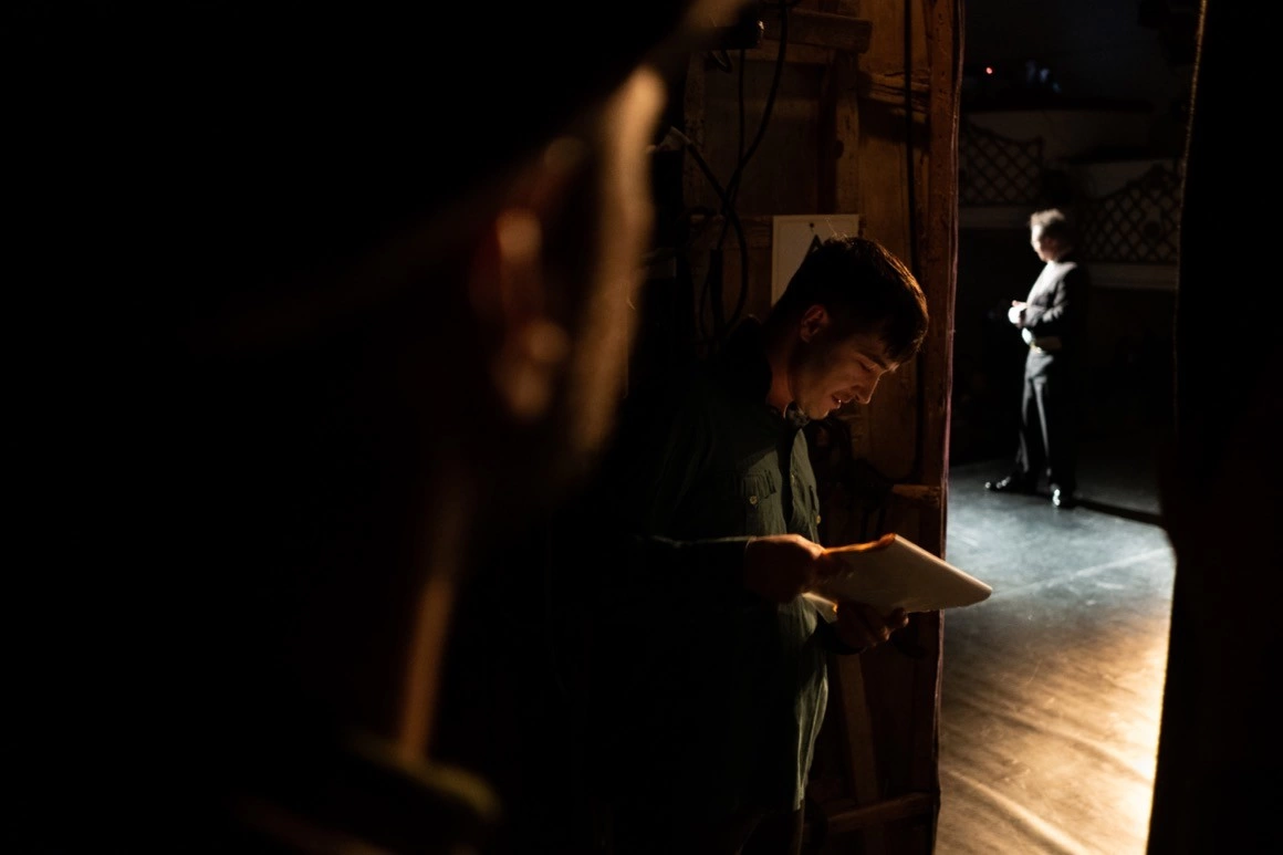 Când Sașa, tânărul din Moldova, intră pe scenă, soția lui se ridică de pe scaun și se duce în față să îl filmeze. Bărbatul joacă în piesa Cântecul Lebedei rolul sufleorului Nikita, care ascultă răbdător lamentările unui actor bătrân.
