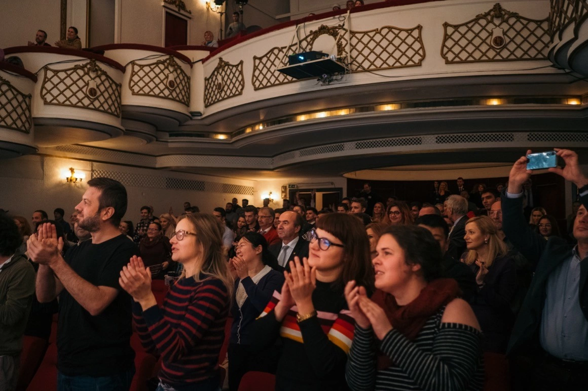 În scurt timp sala e plină, iar cine ajunge cu întârziere trebuie să stea pe margine, lângă angajații teatrului.
