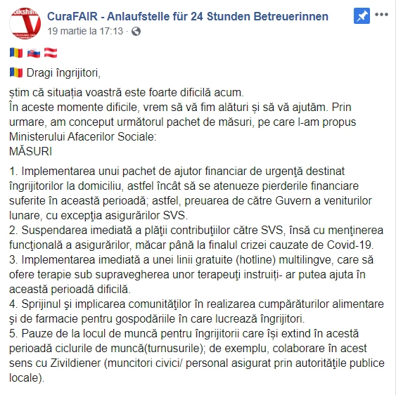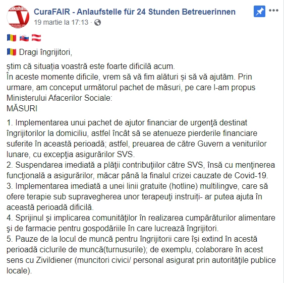 Da. Ne-am uitat pe grupurile de profil și am urmărit ce păreri, ce probleme și ce cereri au femeile îngrijitoare. Le-am discutat în cadrul grupului D.R.E.P.T. și am încercat să facem ceva, să le ajutăm pe colegele noastre. Una dintre ele ar fi legată de plata asigurărilor de sănătate. Compania austriacă de asigurări spune că avem posibilitatea să plătim eșalonat sau să sistăm plățile. Dar nu sunt măsuri speciale pentru branșa respectivă, 24 de ore îngrijire, sunt pentru toți cei cu PFA - frizeri, taximetriști etc.