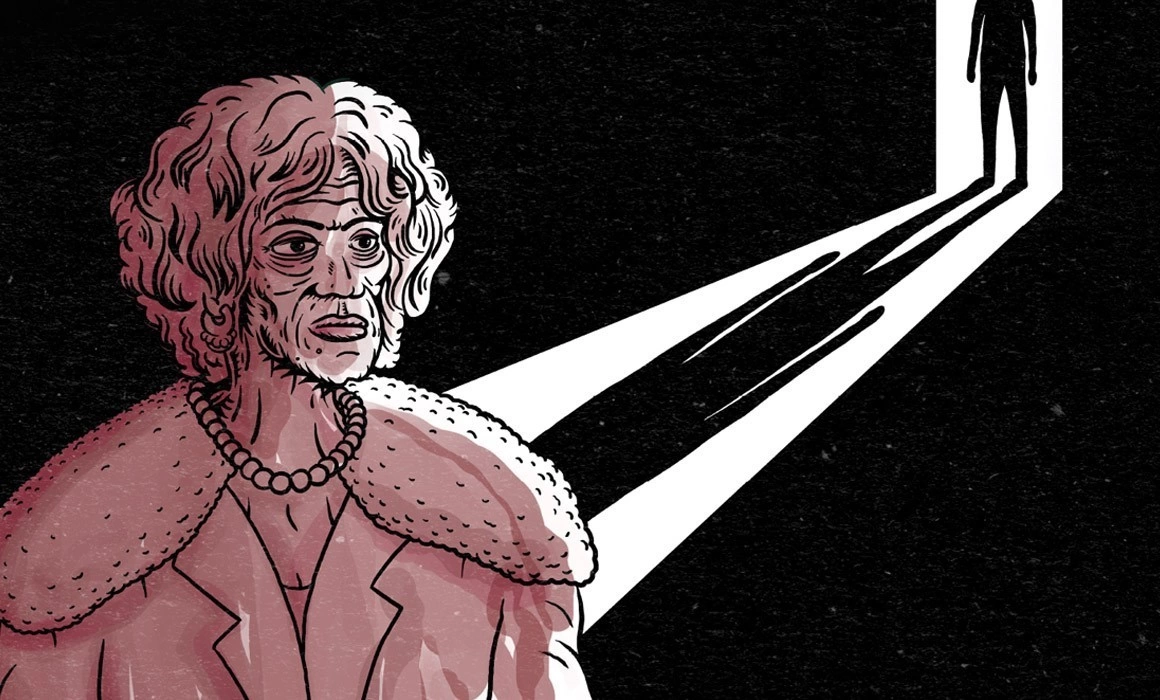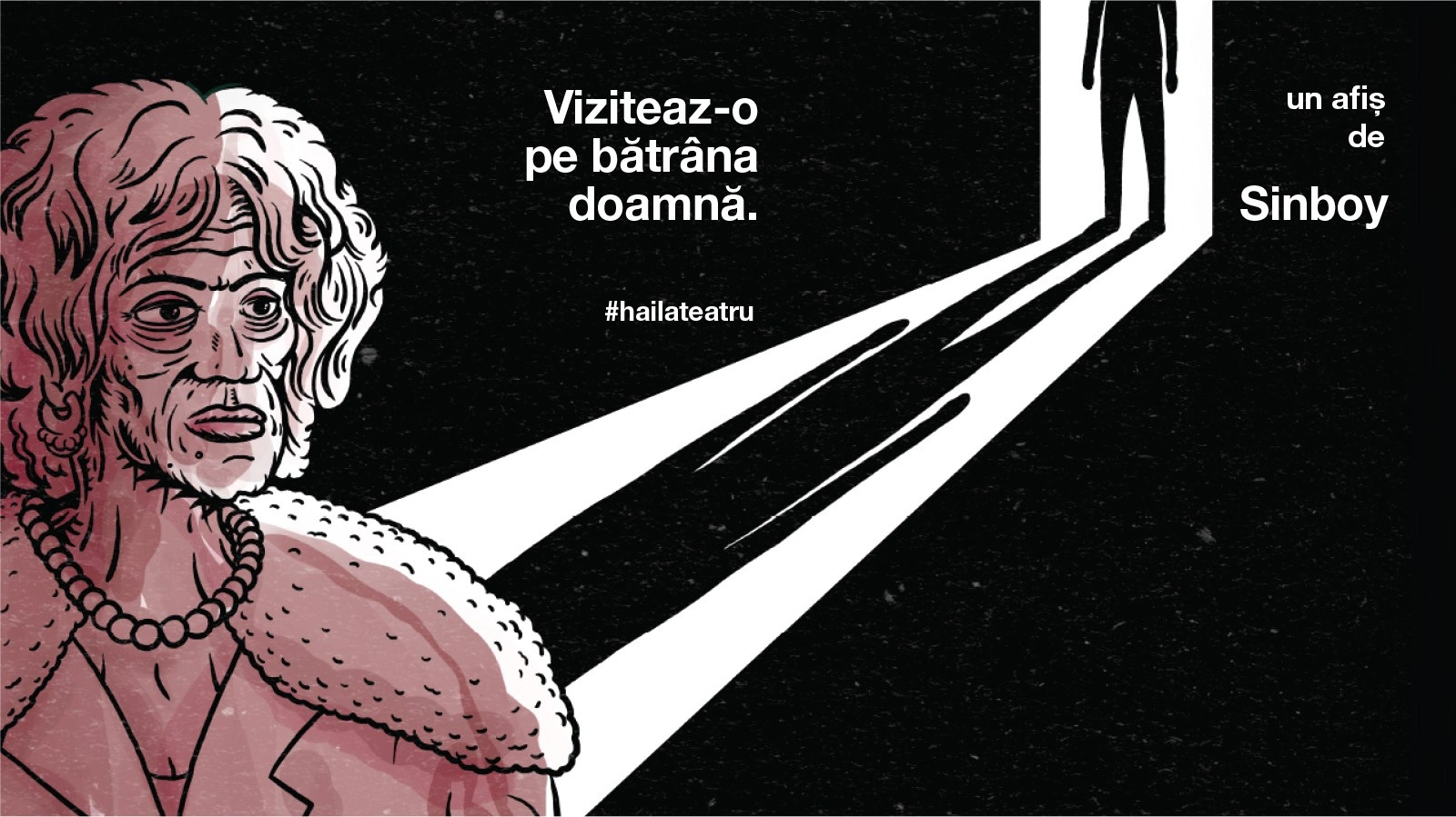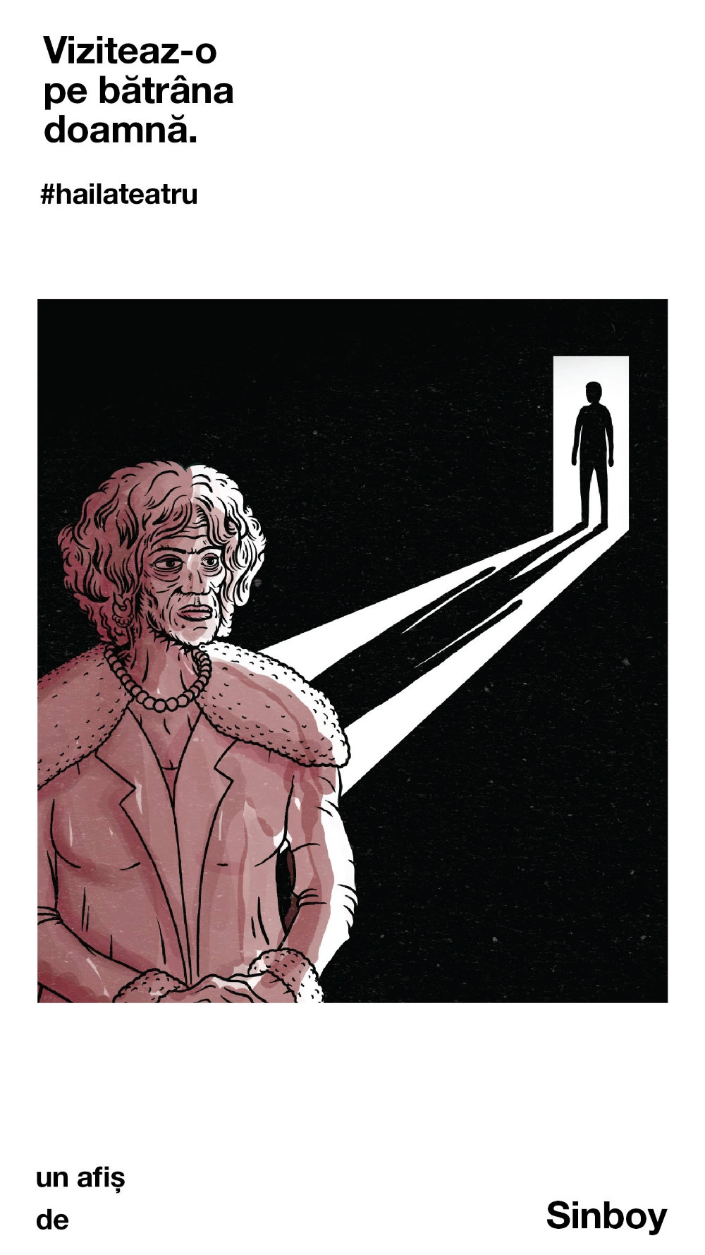 Povestea din Vizita bătrânei doamne, de Friedrich Dürrenmatt, mi s-a părut puternică și dark, și am încercat să surprind în poster tensiunea, cu un twist al spectatorului care merge în vizită.
