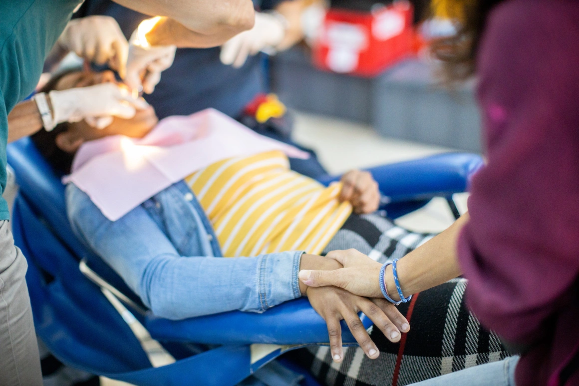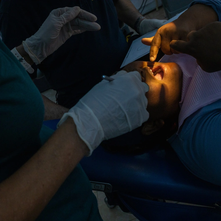 Ilie a venit cu mama lui. Cât ea e pe scaunul albastru, el privește dintr-un colț, cu ochii mari de tot, cum maică-sa se agită pe scaun. „Dacă vrea dinți frumoși, trebuie să stea locului”, îmi cere Sylva să-i traduc femeii. După asta îl întreb pe Ilie câți ani are și scoate din buzunar patru degete. Nadia vrea să știe dacă vrea să se facă doctor și Ilie dă din cap că da.