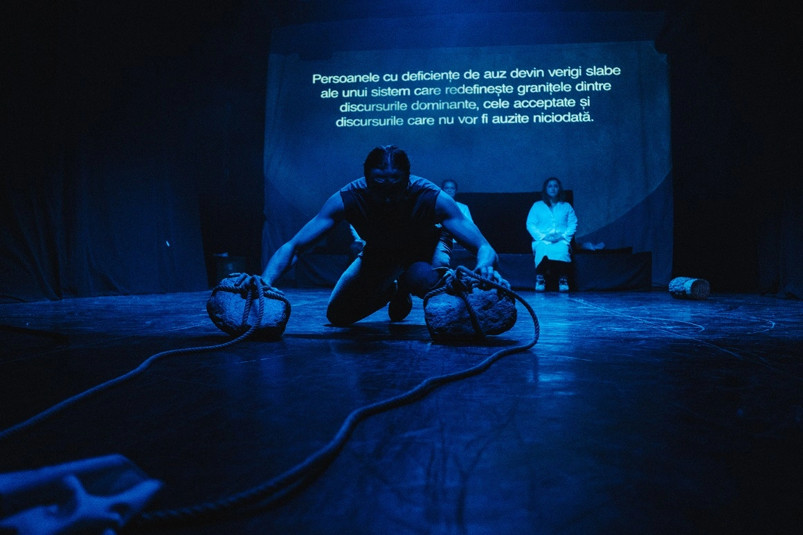 În etapa de documentare a proiectului, Oana Marin și Ovio Olaru au mers pe teren și au intervievat persoane cu deficiențe de auz din Sibiu și împrejurimi, întâlniri facilitate de interpreta Anamaria Stoica. Inserțiile antropologice din spectacol de acolo vin. Pe această cale am aflat și despre neîncrederea pe care o au persoanele din comunitate în intențiile auzitorilor, izolarea la care sunt supuse fiind dublată de autoizolare. A urmat un curs intensiv de limbaj mimico-gestual (LMG), coordonat de interpreta Anamaria Stoica, cu invitație deschisă către actrițele, actorii, personalul bibliotecii universitare, cadrele didactice și echipa de implementare. Timp de mai multe luni, absolvenți și studenți ai specializării de Artă Teatrală și doi actori amatori cu deficiențe de auz au lucrat împreună la pregătirea unui spectacol de teatru care pune în practică conceptul de disability theatre și aduce în discuție normele sociale actuale care privesc integrarea persoanelor cu dizabilități în comunitate. Pe lângă stereotipurile perpetuate mai mult sau mai puțin conștient în viața de zi cu zi (și aici intră tot arsenalul de termeni peiorativi cu care ne deprindem încă de mici), lipsa reprezentării acestora în domenii precum artele performative contribuie în bună măsură la segregarea lor, la izolare și autoizolare.